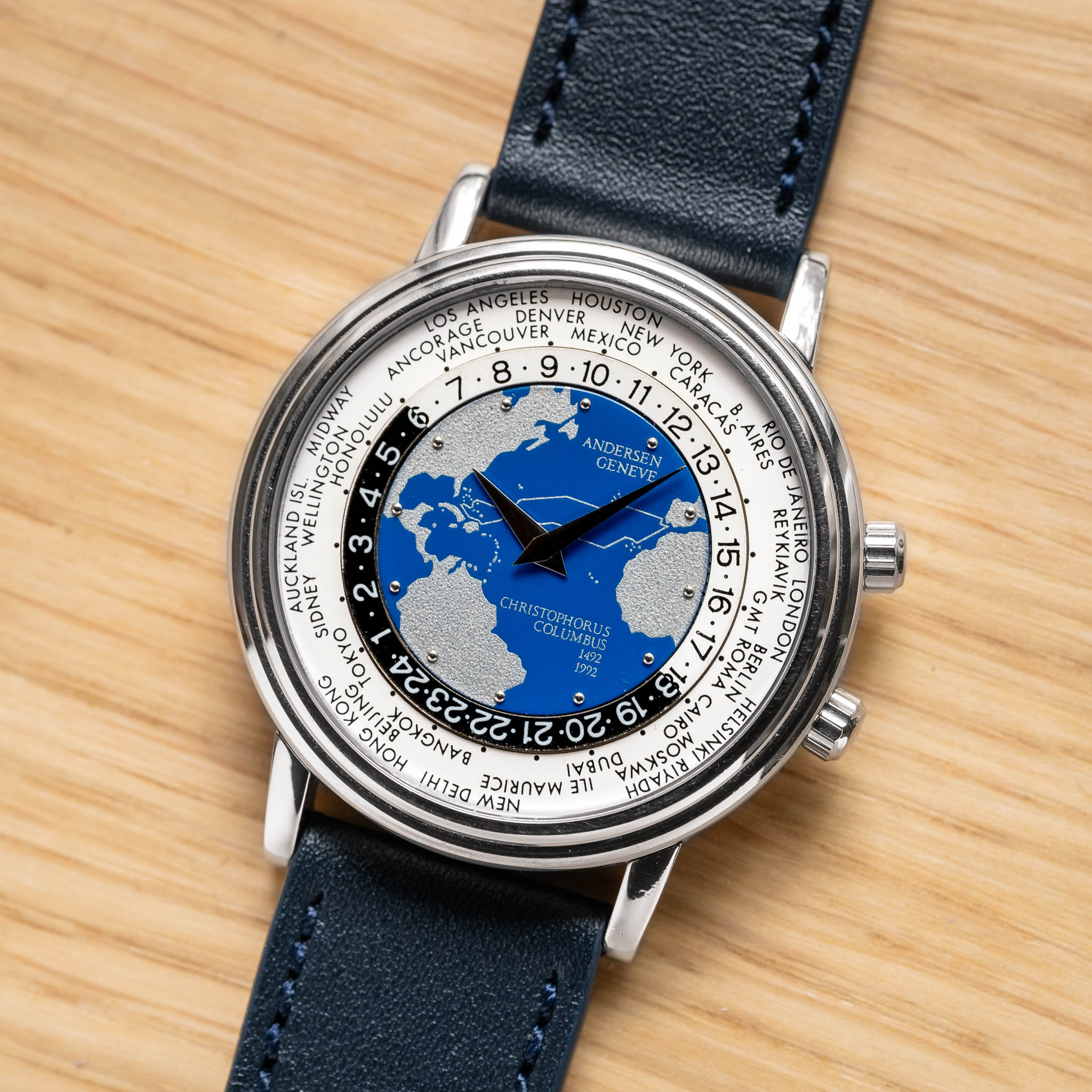 My first foray into independent watchmaking begins with the Christophorus Columbus Worldtime in platinum from Andersen Genève. This was Andersen's second edition of a worldtime watch, produced in 1992 to commemorate the 500th anniversary of the voyage of Christopher Columbus. A total of 500 examples were made — 300 in yellow gold, 100 in white gold, 50 in red gold, and 50 in platinum, each with a vibrant lacquered dial and a wonderfully proportioned 35.5mm case.