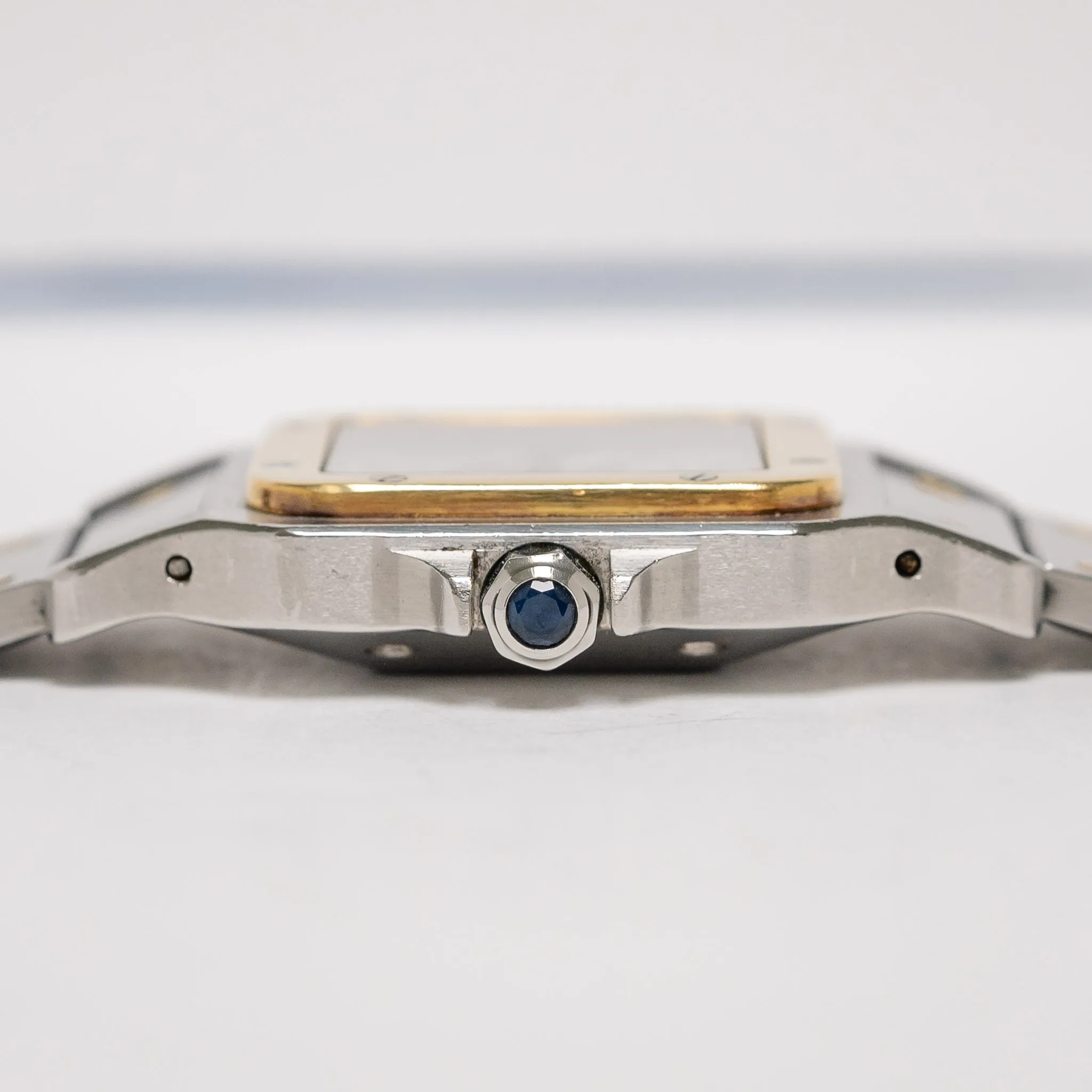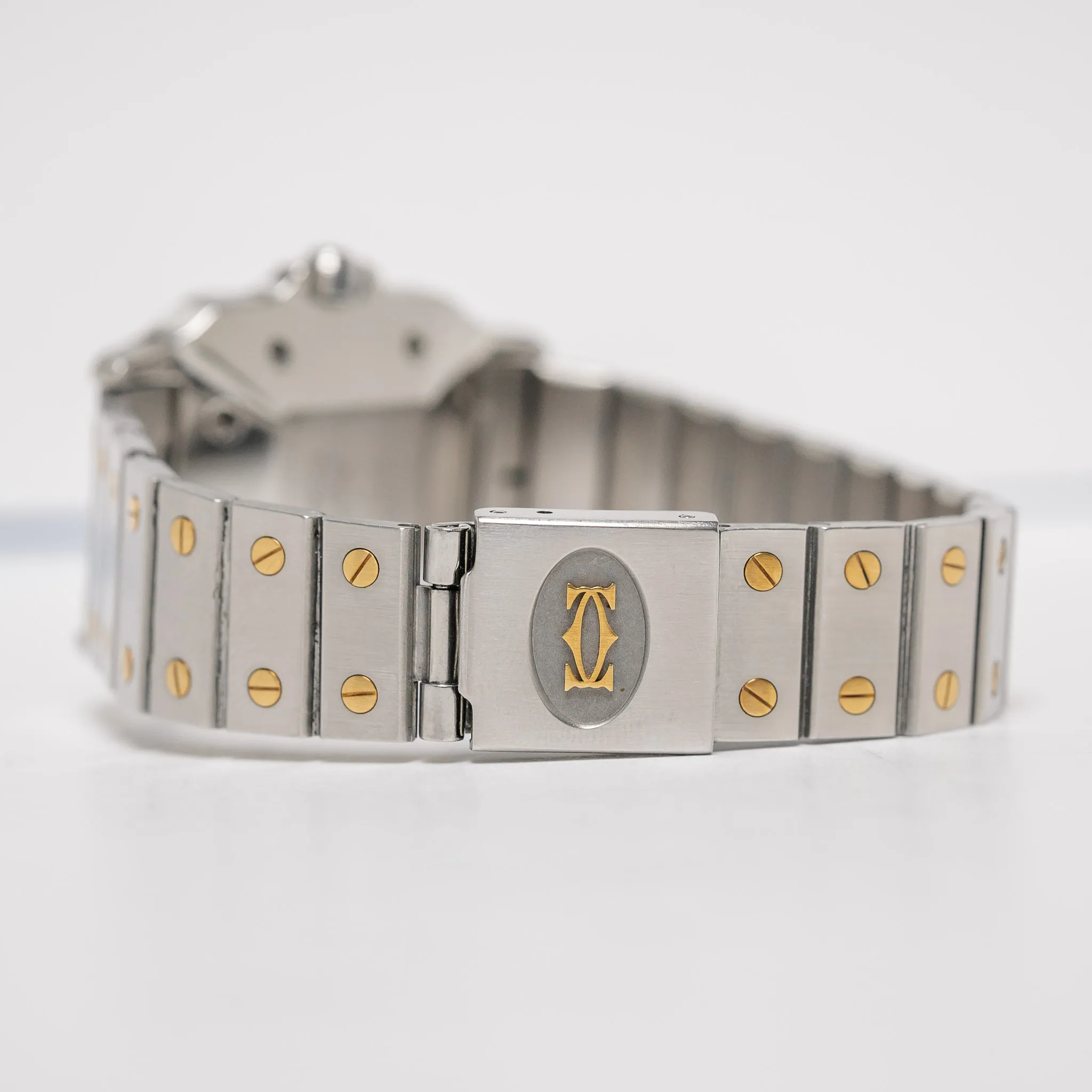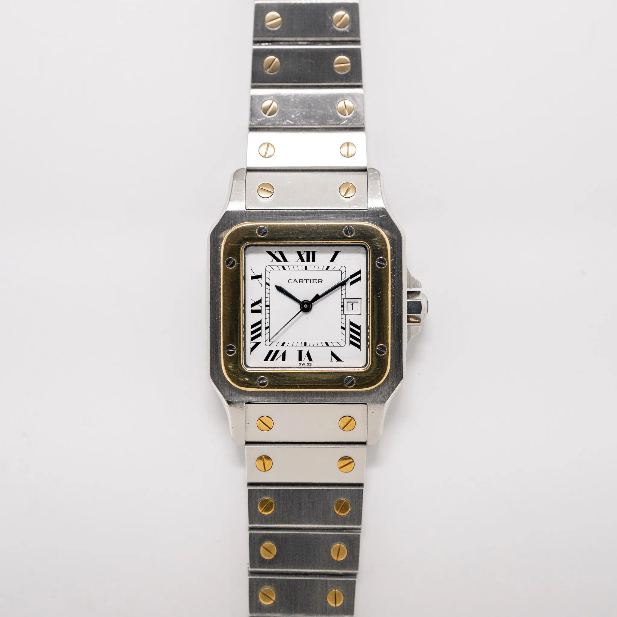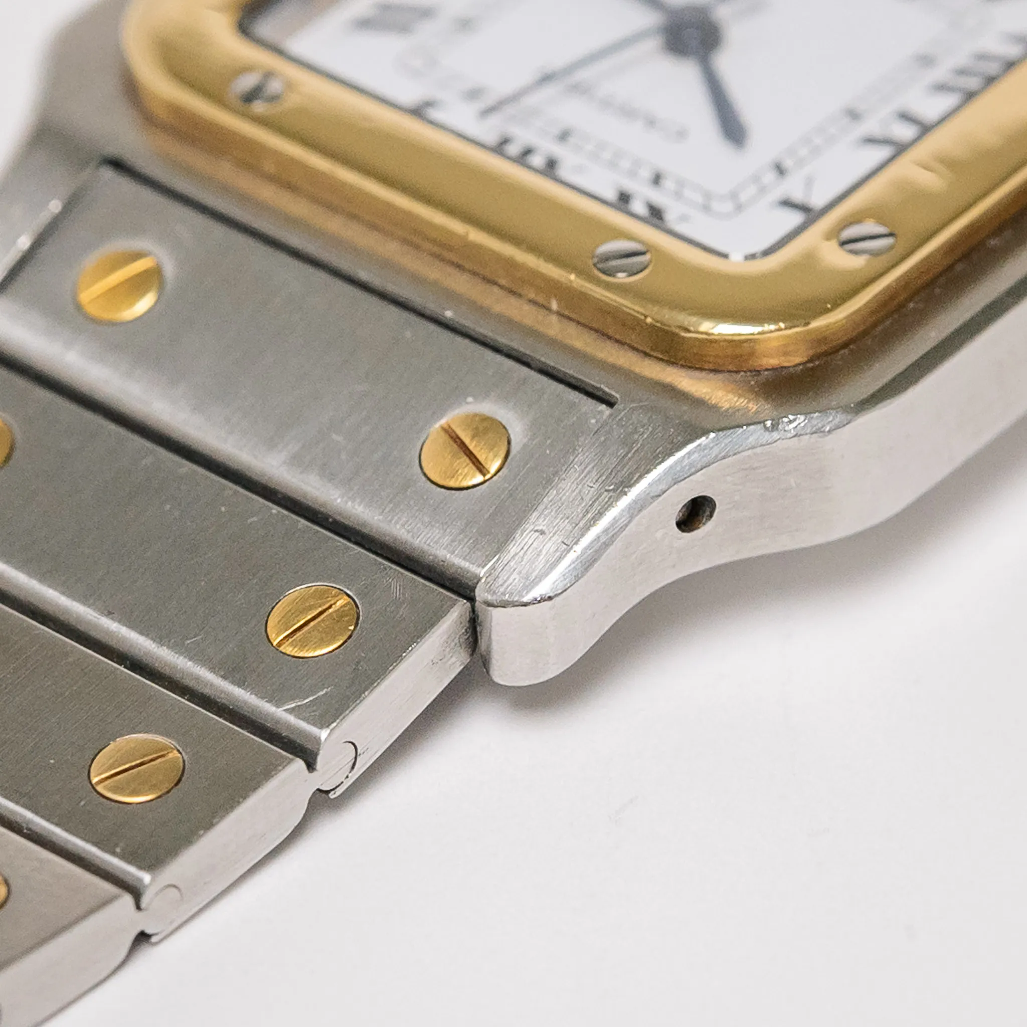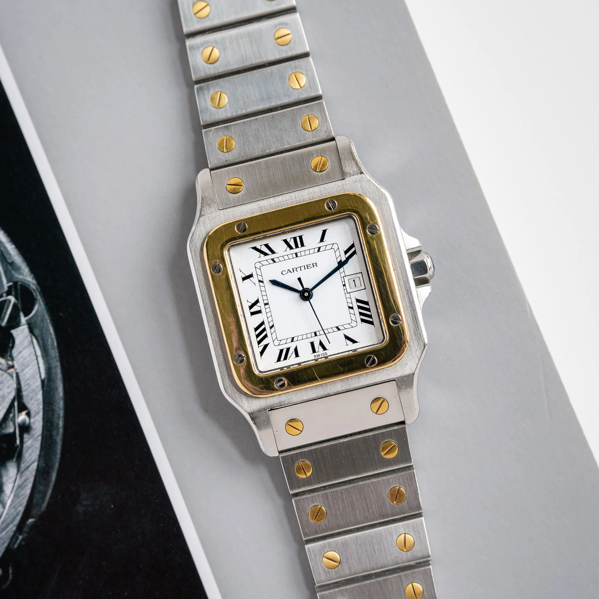 A Santos Carrée with a white enamel dial, a beautifully squared two-tone case, and the Cartier 077 automatic movement.
