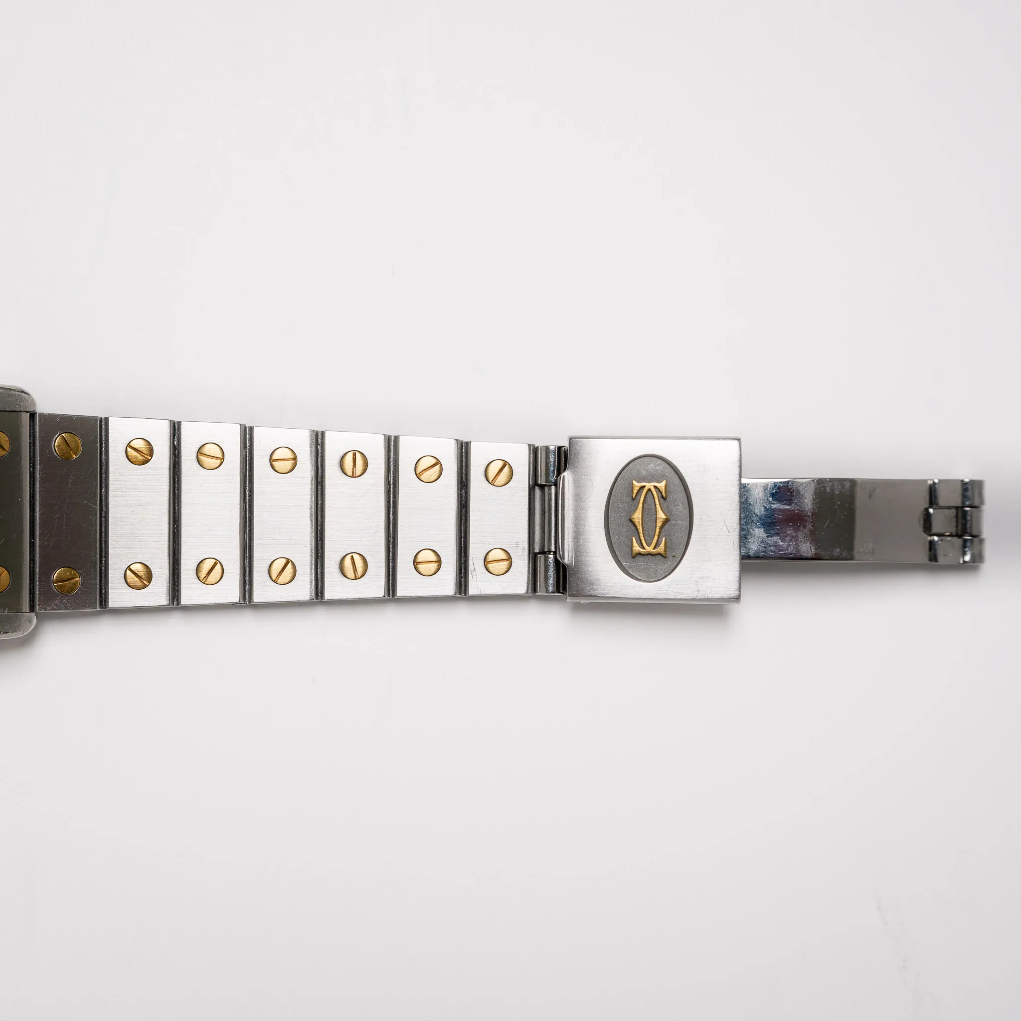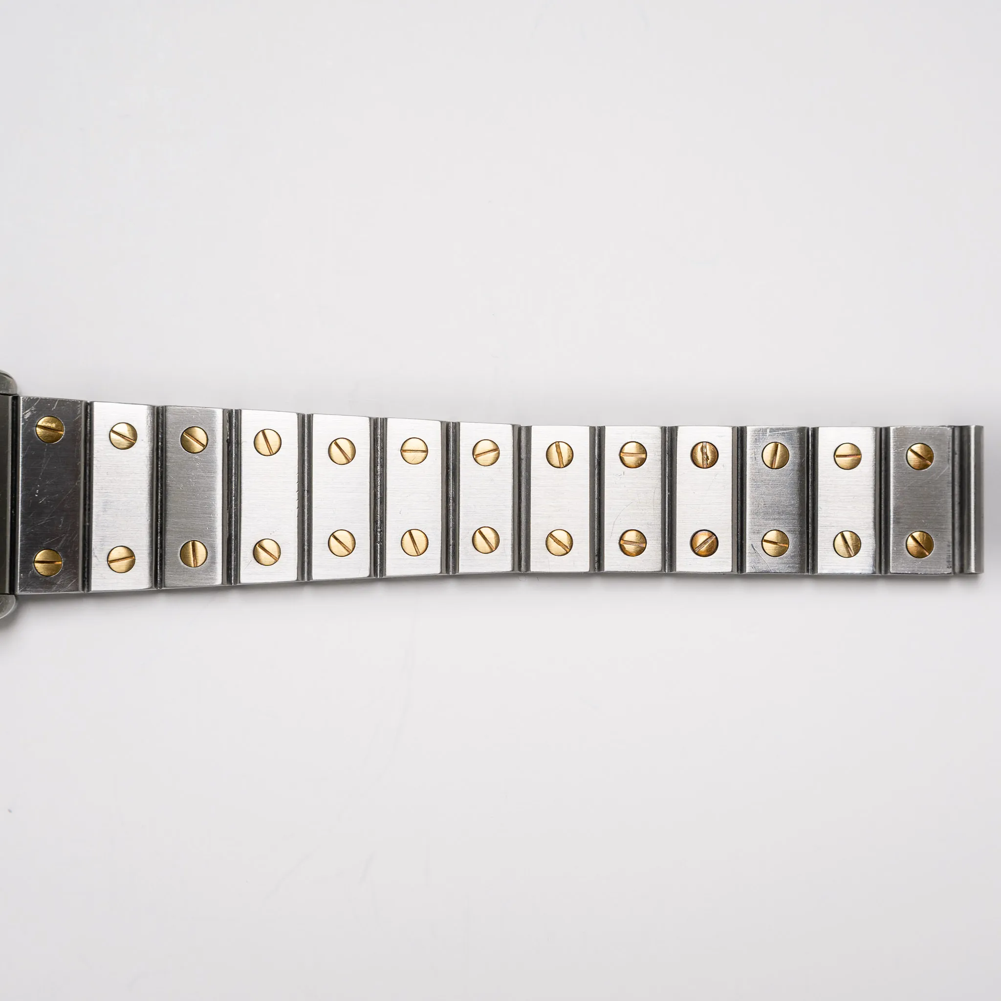 Cartier Santos Carrée on a stainless steel bracelet with gold screws.