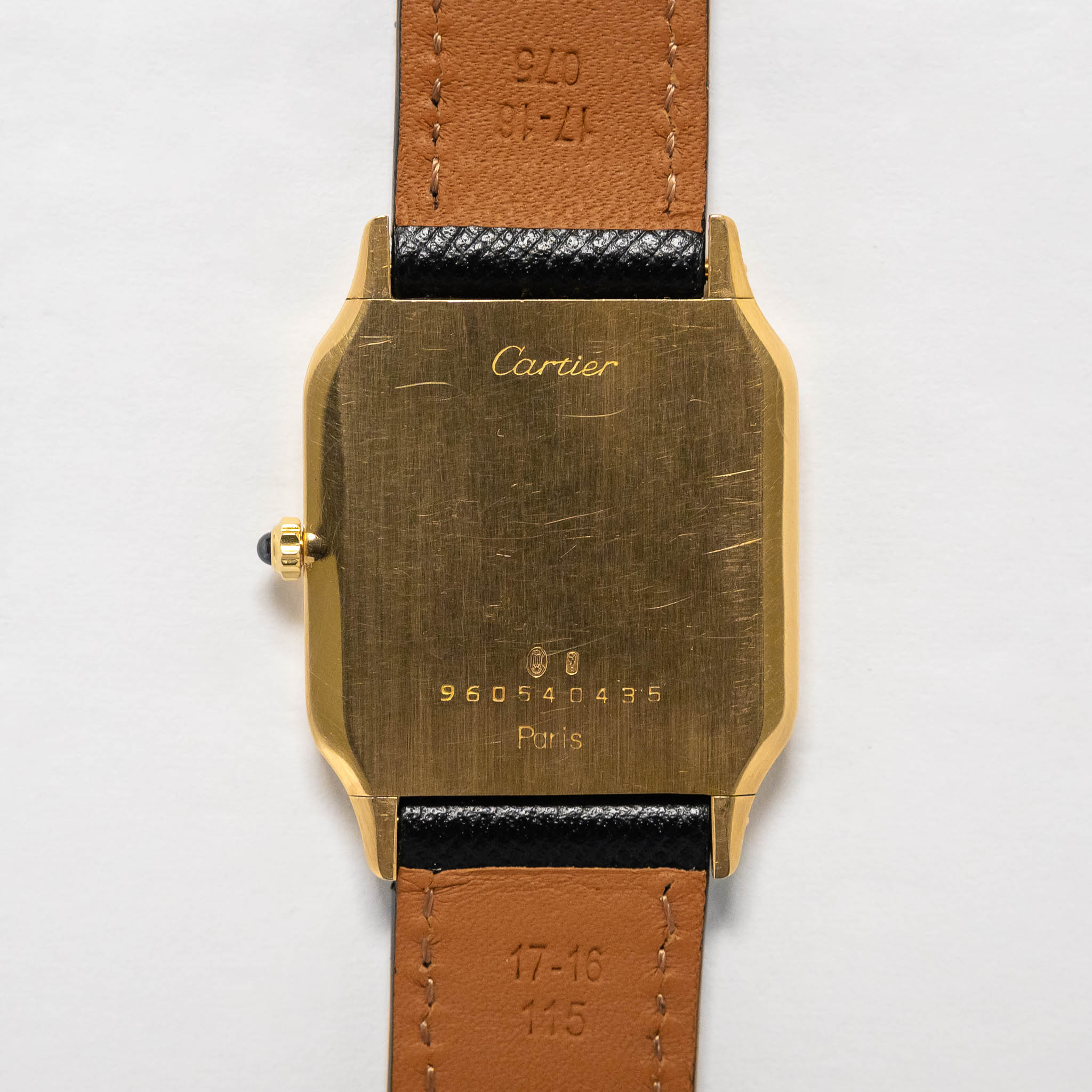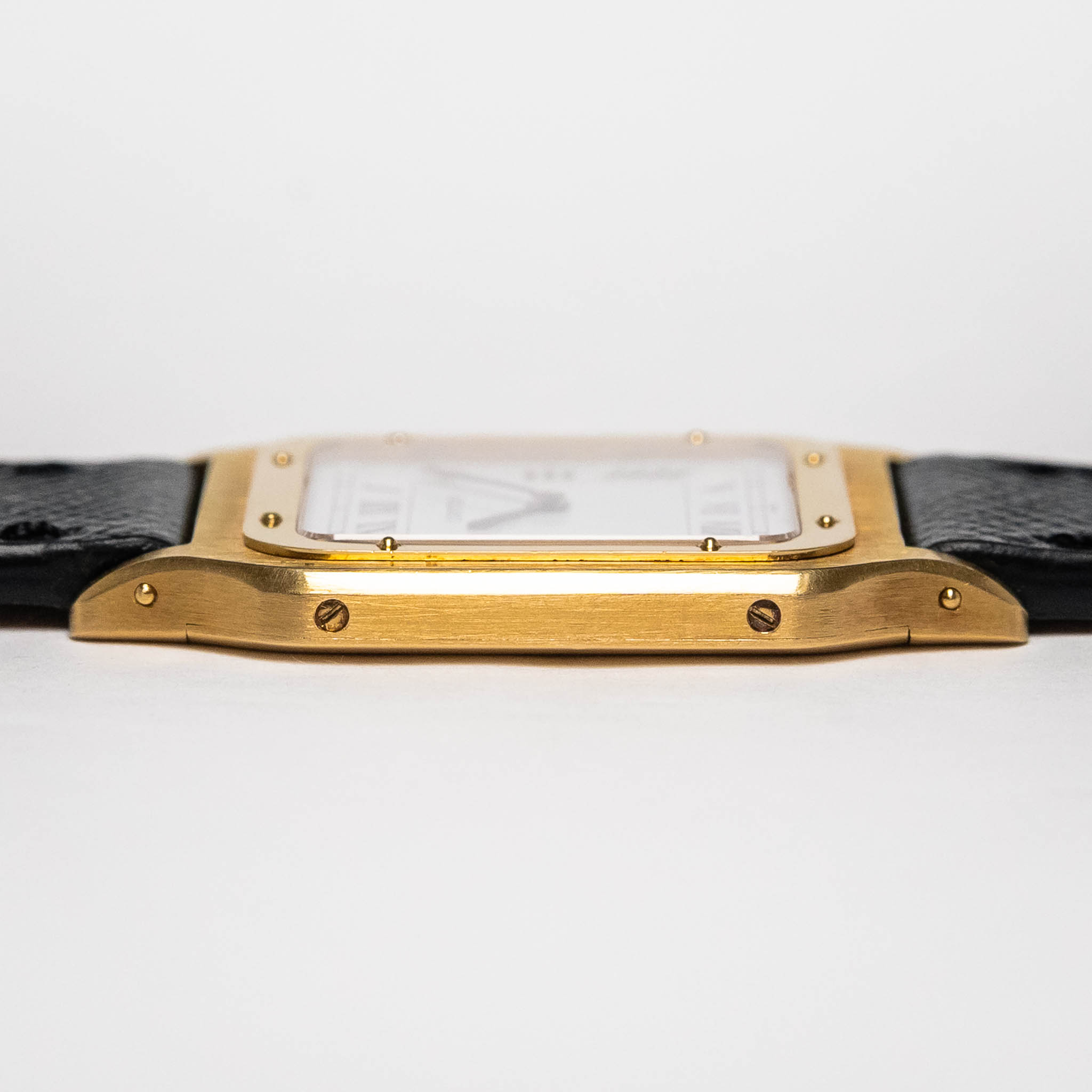 Highlighted by a flat case and a square bezel decorated with rivets, the design of the Santos-Dumont has remained largely unchanged over the years. While reference and production numbers during the early and mid-century aren’t well known, things changed when Cartier transitioned to Switzerland-based watchmaking and serialized their production in the 1970s. During this time the Santos-Dumont was re-released in a 24mm size under the reference number 78097.