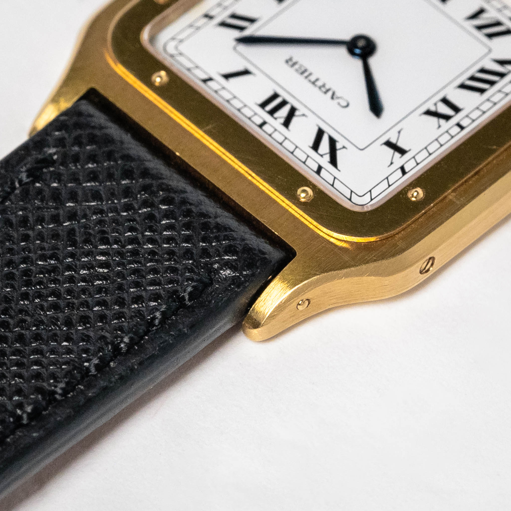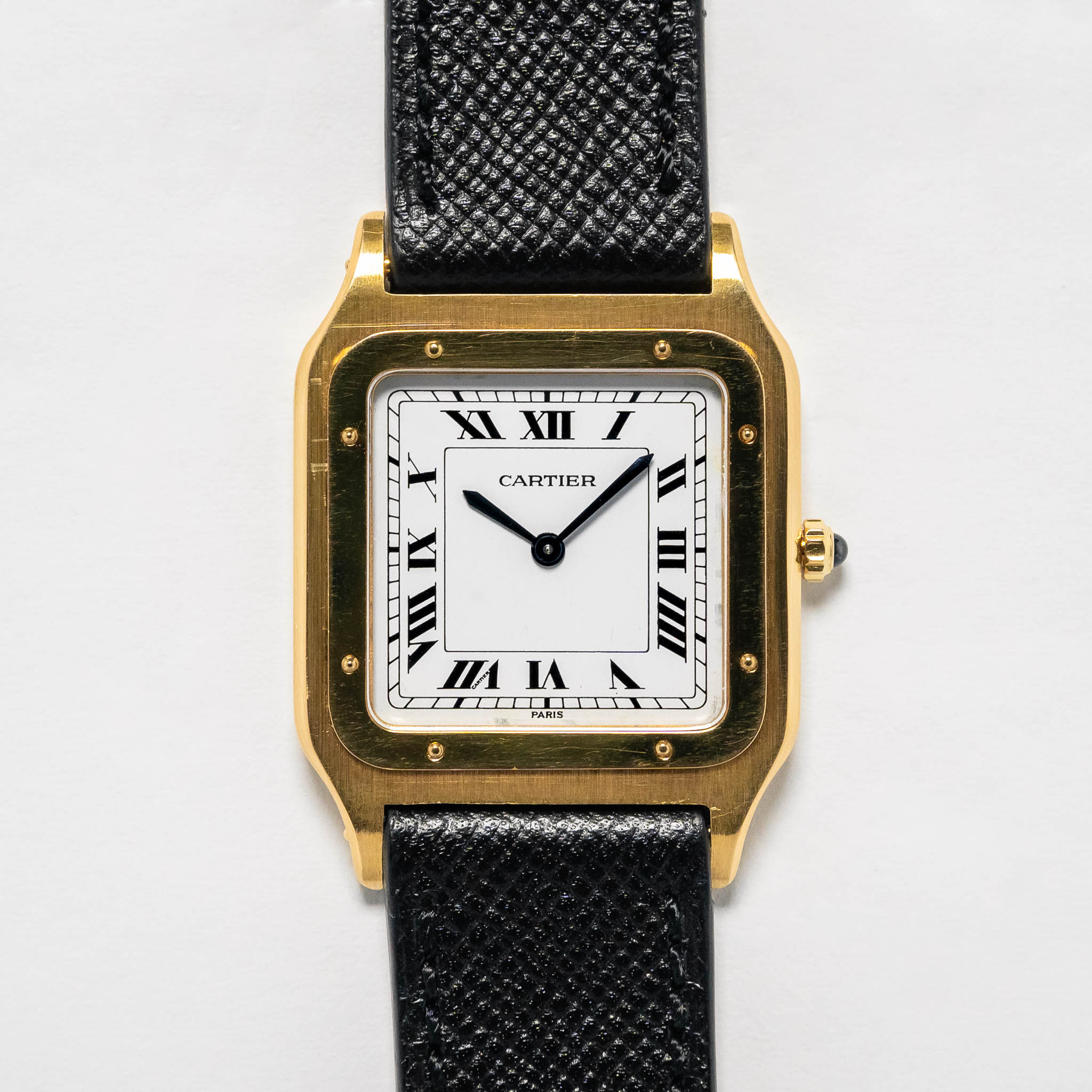 Highlighted by a flat case and a square bezel decorated with rivets, the design of the Santos-Dumont has remained largely unchanged over the years. While reference and production numbers during the early and mid-century aren’t well known, things changed when Cartier transitioned to Switzerland-based watchmaking and serialized their production in the 1970s. During this time the Santos-Dumont was re-released in a 24mm size under the reference number 78097.