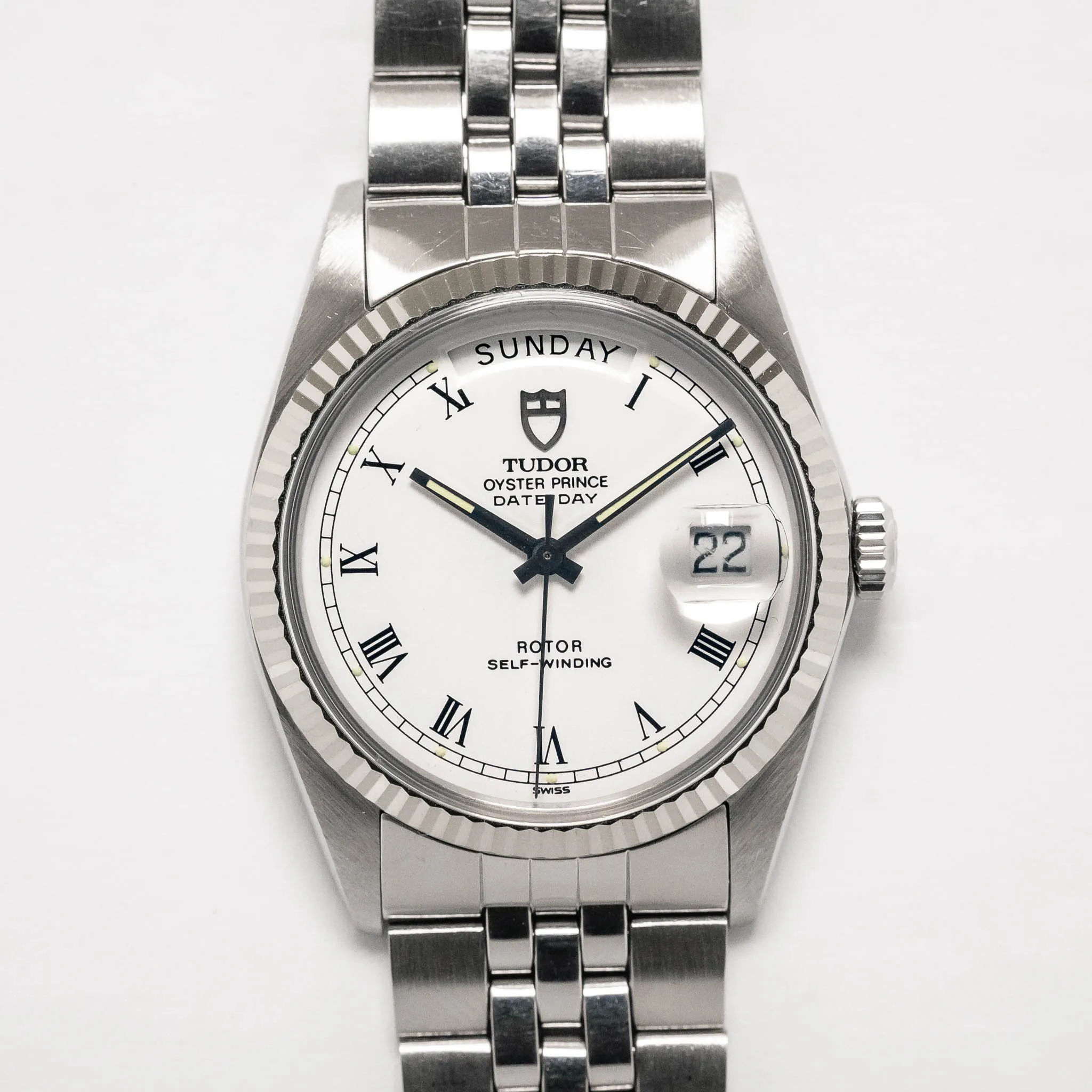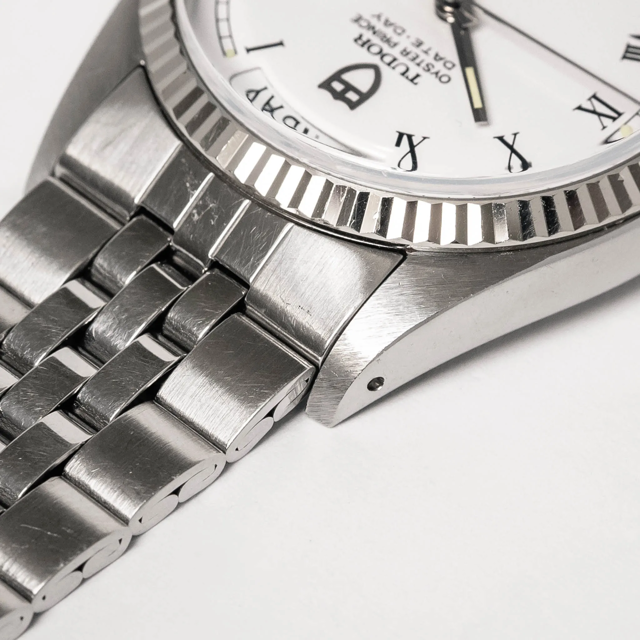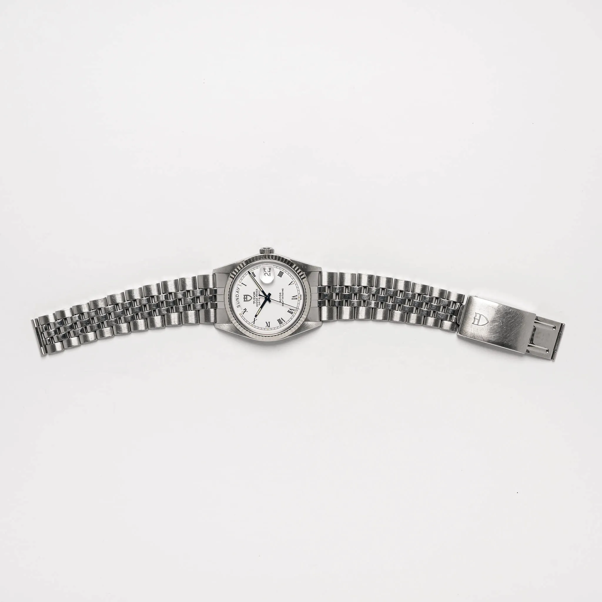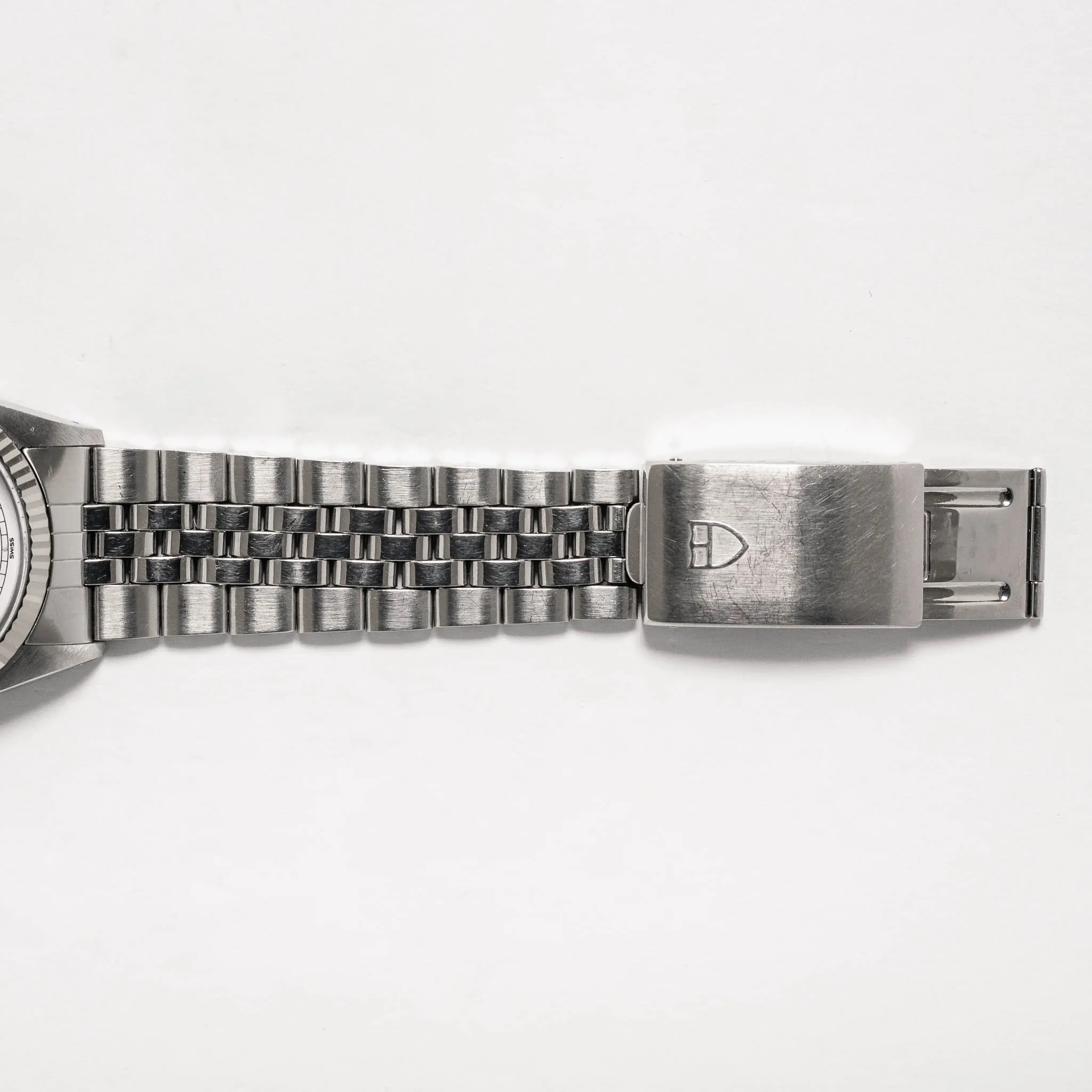 Conceived in an era where Tudor served as the accessible proving ground for Rolex’s most iconic silhouettes, the reference 94614 is the steel Day-Date that bridged the gap between functional complexity and high-society style. While Rolex strictly reserved its flagship dress watch for precious metals, Tudor utilized a 36mm steel Oyster case — complete with a white gold fluted bezel — to offer a more resilient alternative to its venerable older brother. Introduced in the late 1970s and produced through the 80s, the 94614 is distinguished by its use of the ETA 2834-2 movement, allowing for the same prestigious "top-arc" day display found on the Day-Date.