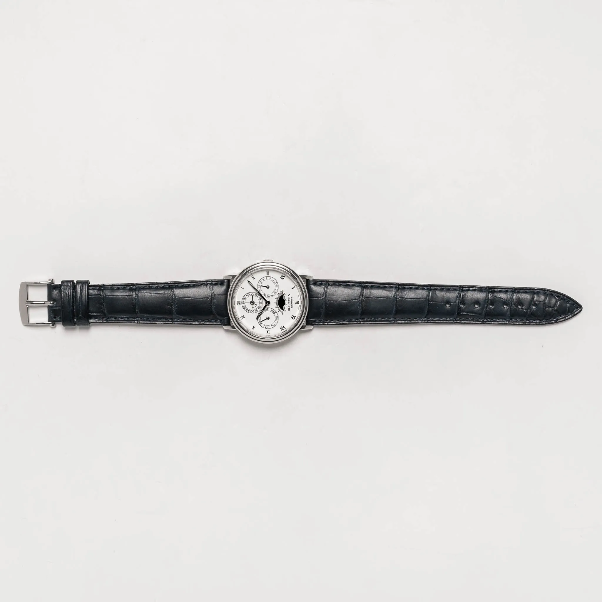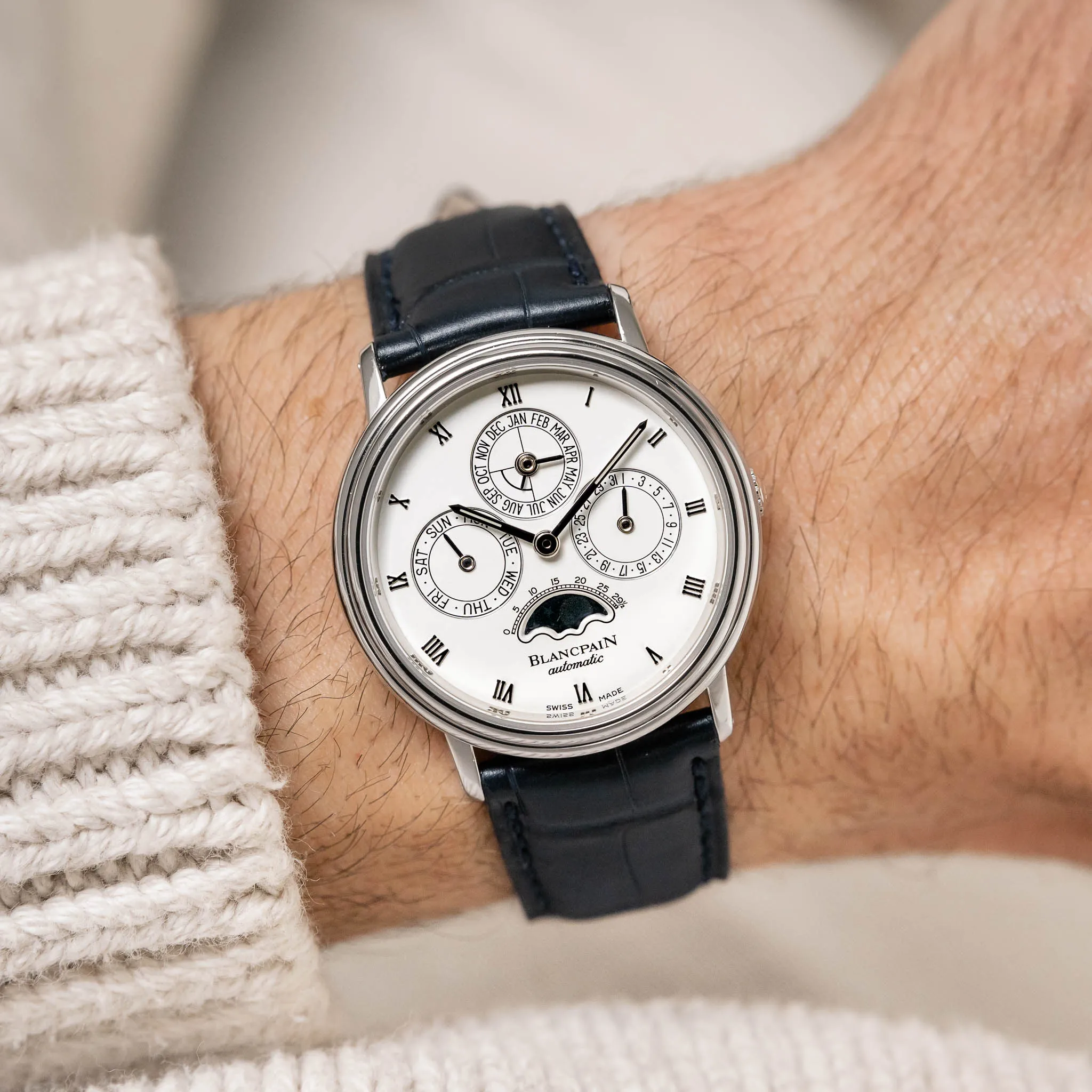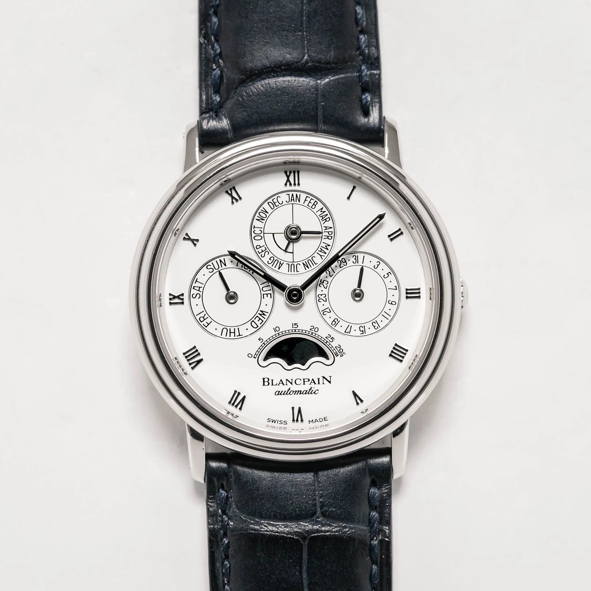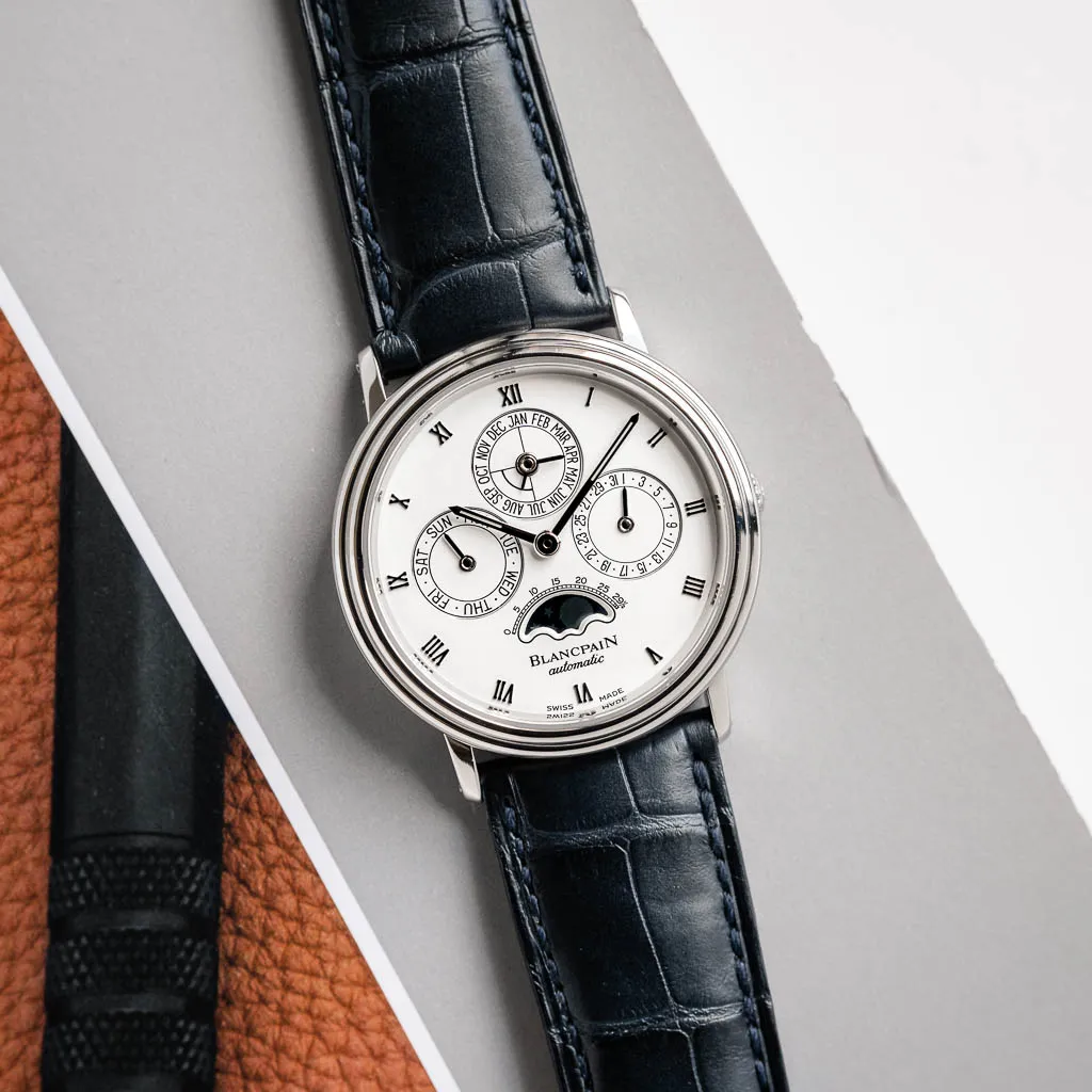 Blancpain Villeret Perpetual Calendar on a navy alligator strap.