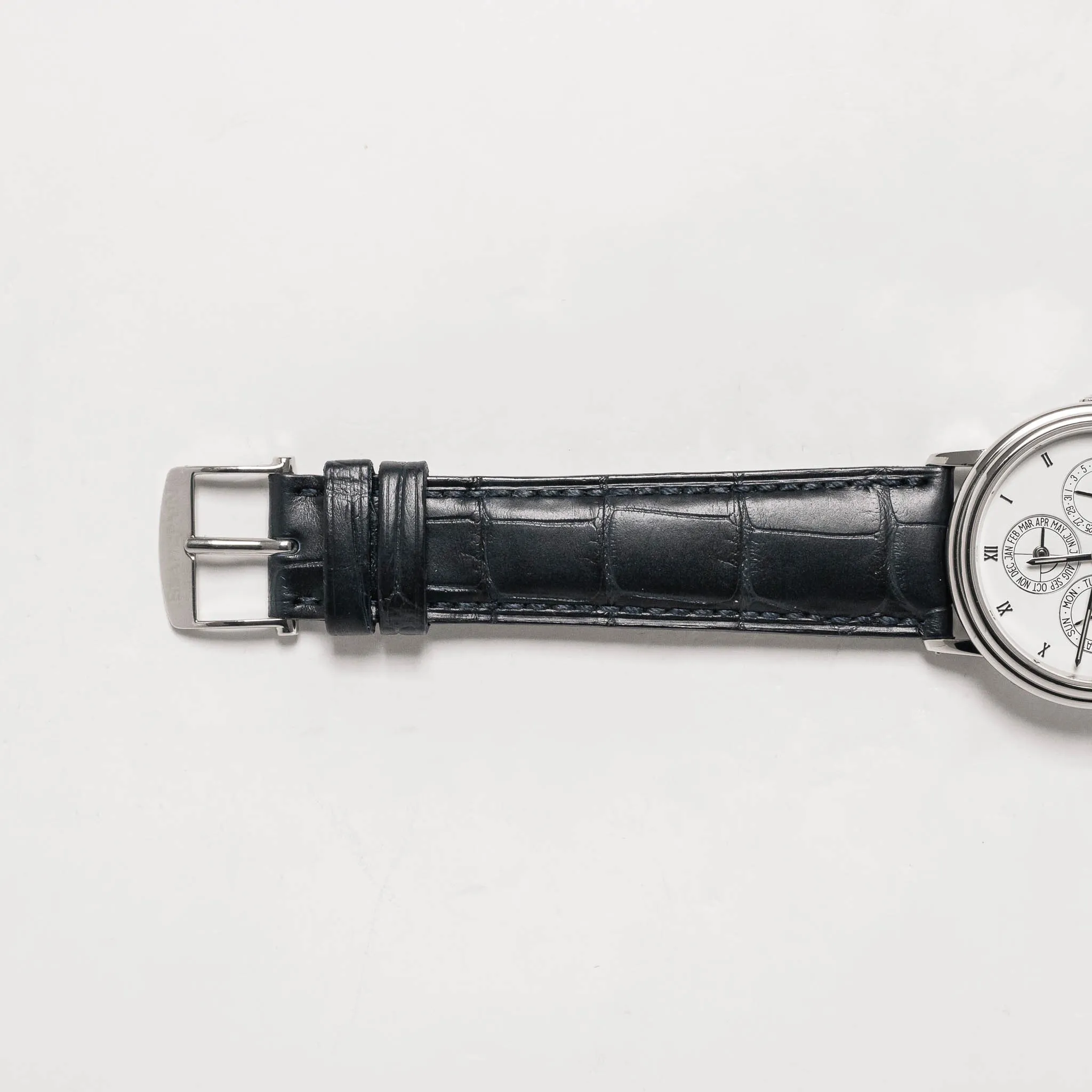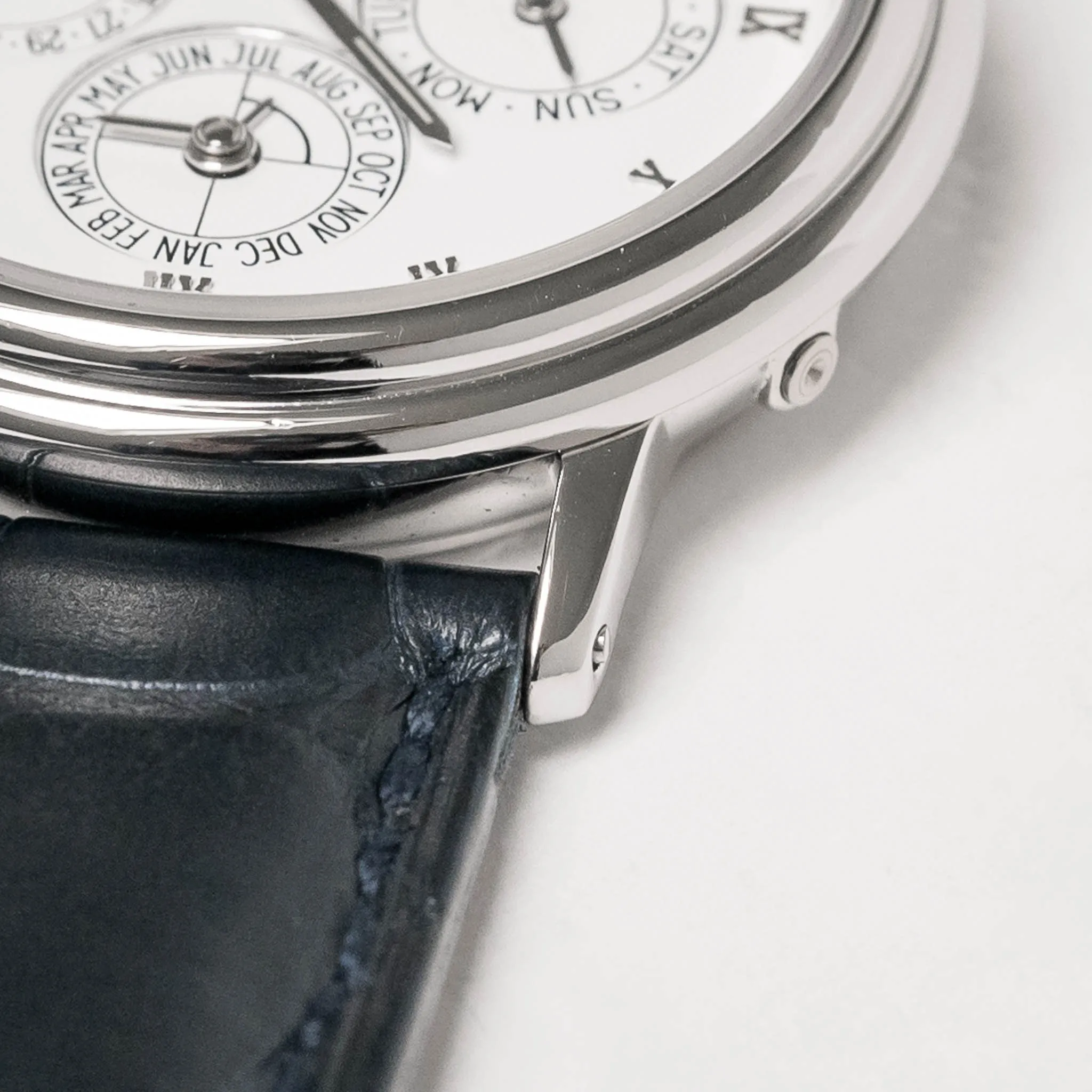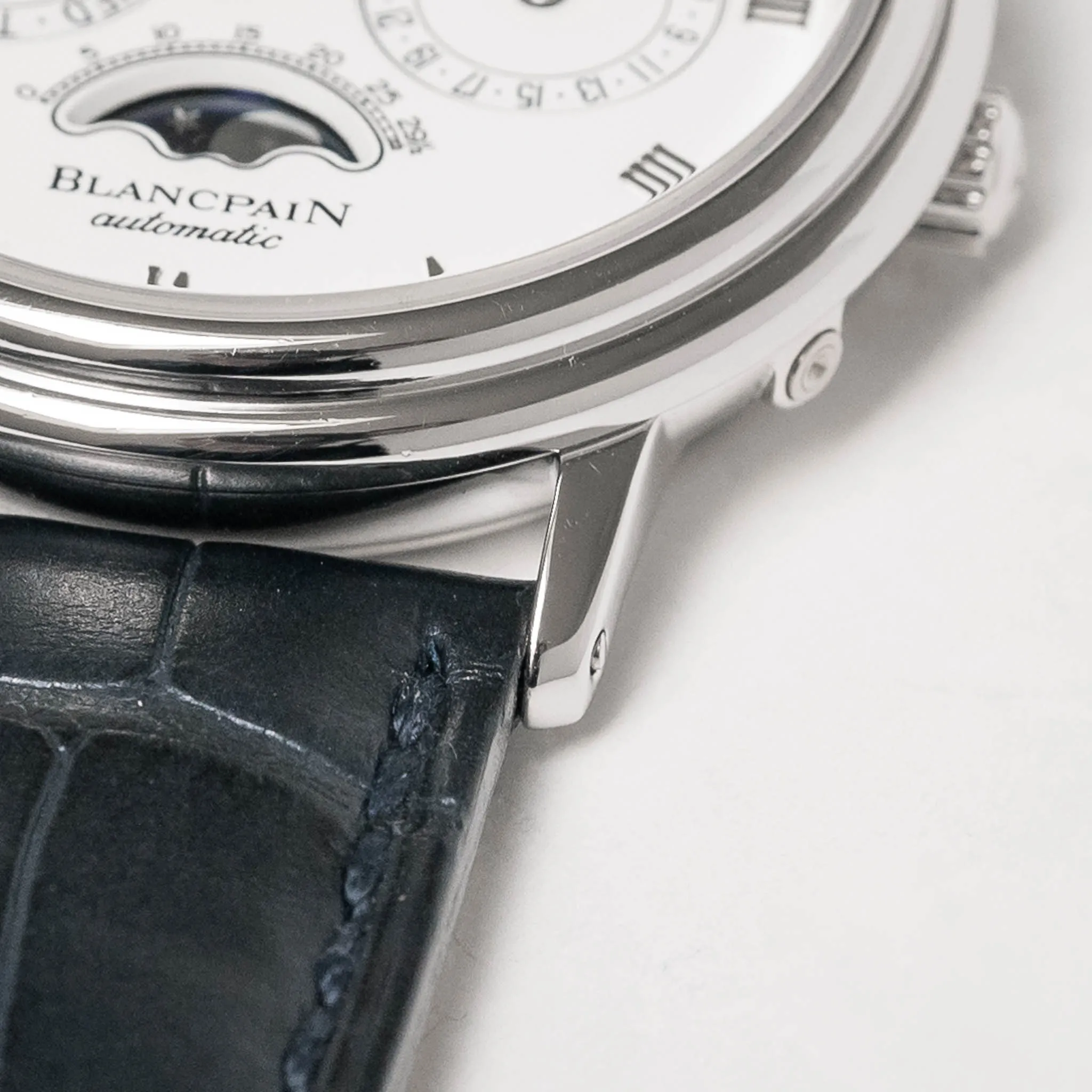 Blancpain Villeret Perpetual Calendar on a navy alligator strap.