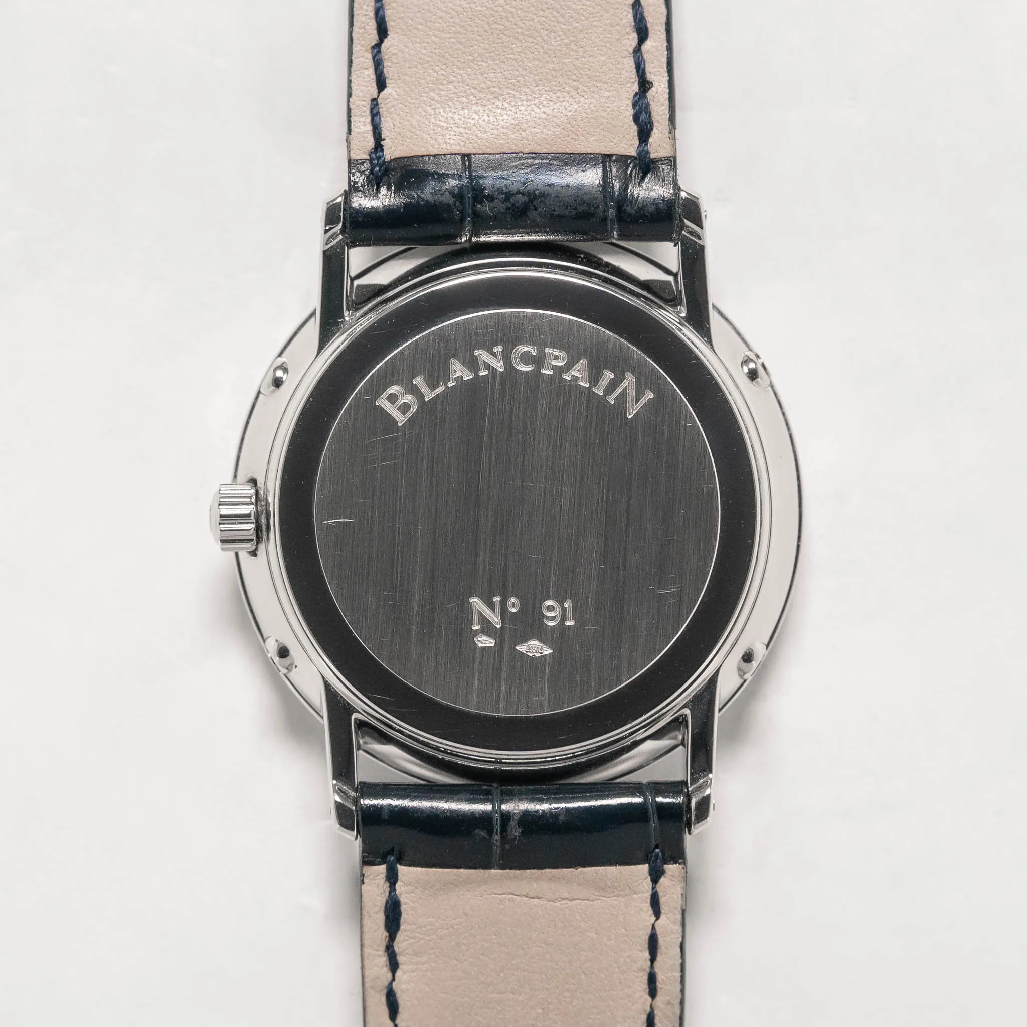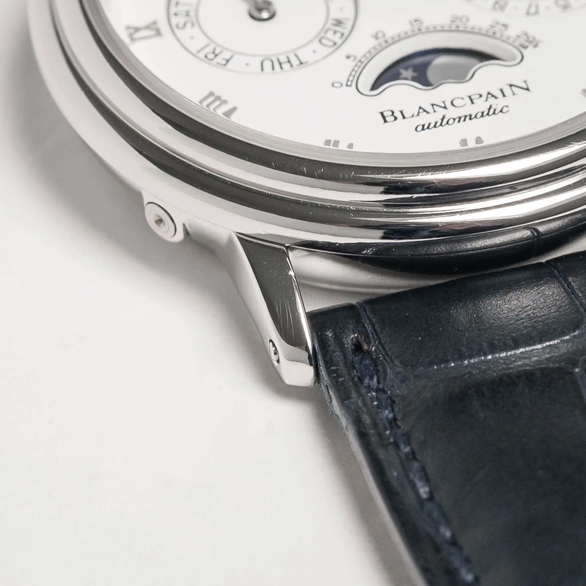 Bracelet/Strap: The Blancpain navy alligator strap shows practically no wear and remains in fantastic condition. The Blancpain signature on the platinum buckle is slightly faded from polishing, but remains legible. Otherwise the buckle exhibits minimal wear and is consistent with the rest of the case.