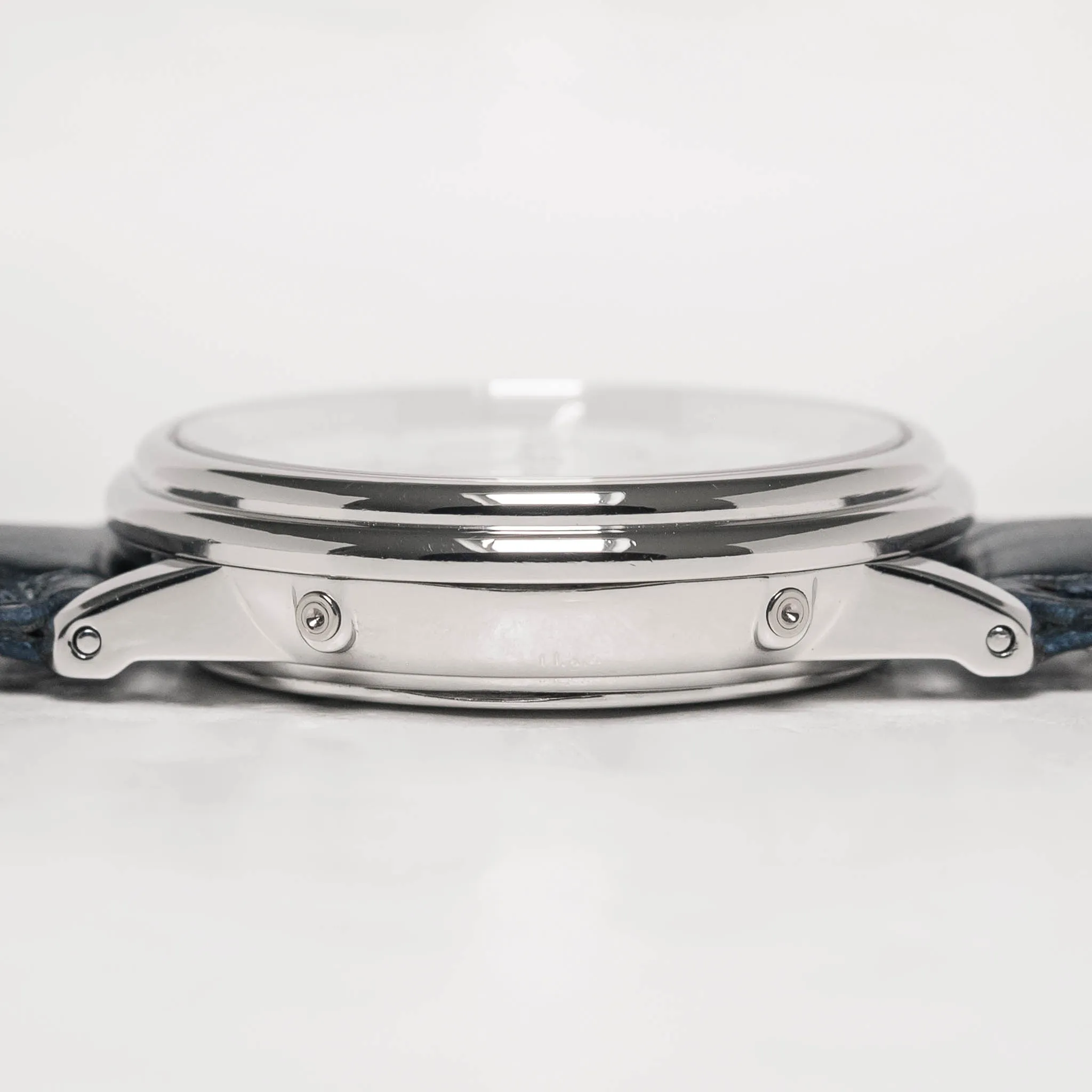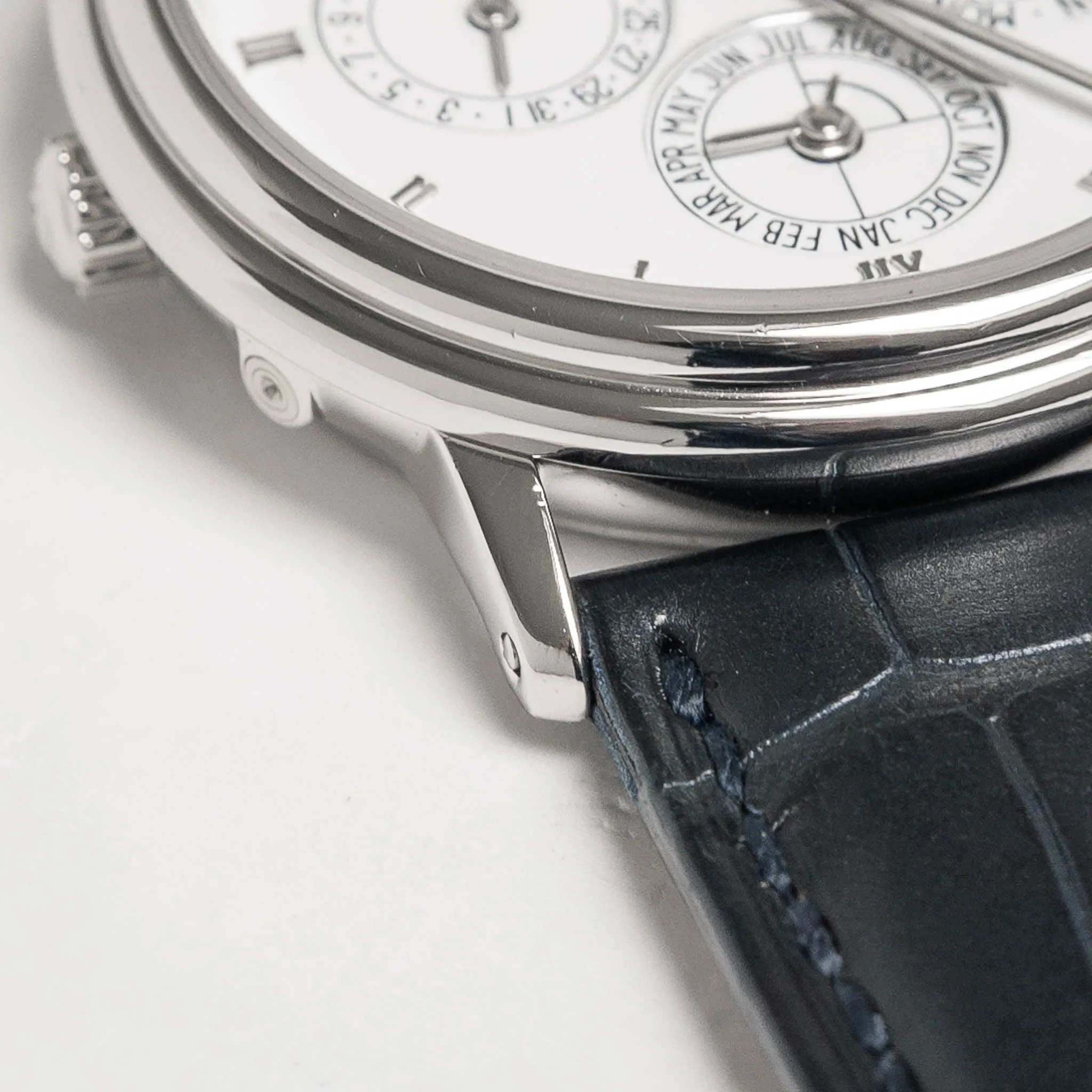 Case: The platinum case shows light signs of wear in the form of a few hairlines, tiny nicks, and micro dings, but the overall impression is very clean. The lugs show light signs of polishing but remain well-defined. The caseback has a few hairlines and tiny scratches and retains clear delineation between brushed and polished surfaces. The brand and serial number engravings, as well as the platinum hallmarks, are crisp and detailed. The backs of the lugs show faint signs of prior strap removal.