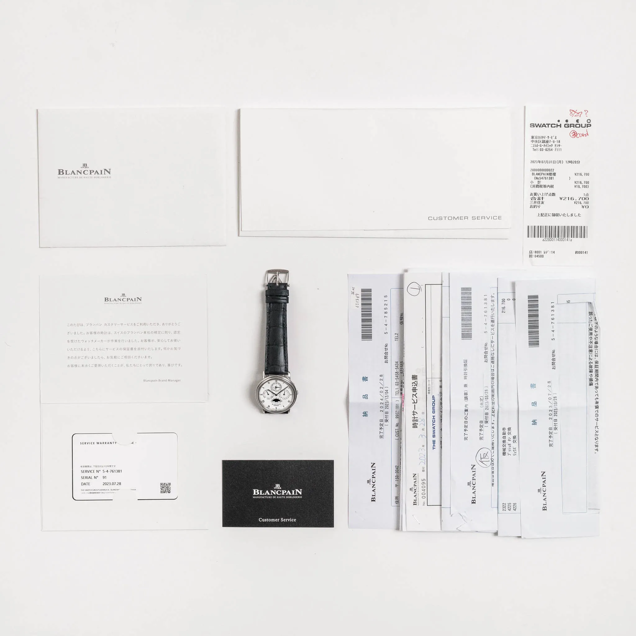 Service records from Blancpain Japan dated July 2023 and December 2023.