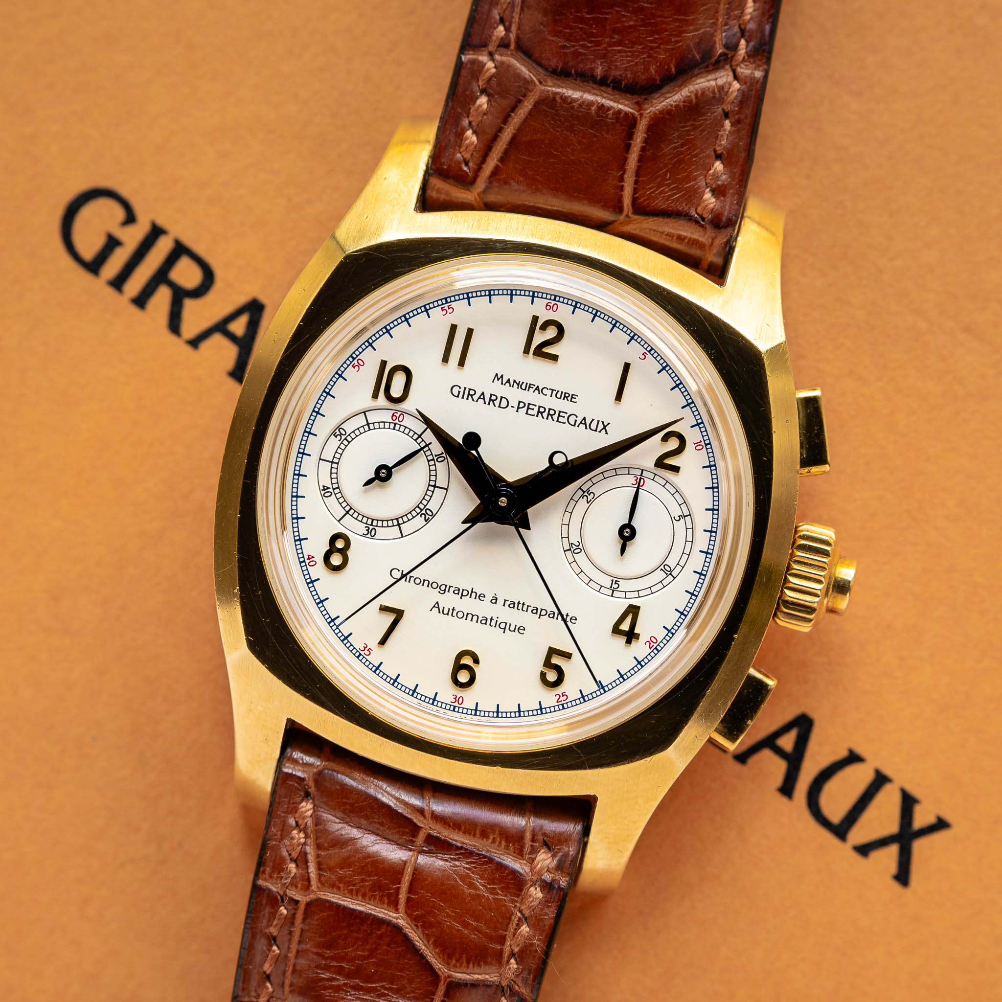 The reference 9012 emerged during the 1990s when Girard-Perregaux was combining high-complication movements with the Art Deco-inspired designs of their Vintage 1945 and Richeville collections. This particular model features a cushion-shaped case that houses a modified movement with a rattrapante (split seconds) complication — one of the most difficult horological feats to engineer. Girard-Perregaux offered the 9012 in several configurations, including stainless steel, yellow gold, white gold, and pink gold, often paired with elegant dials ranging from classic cream and silver to black.