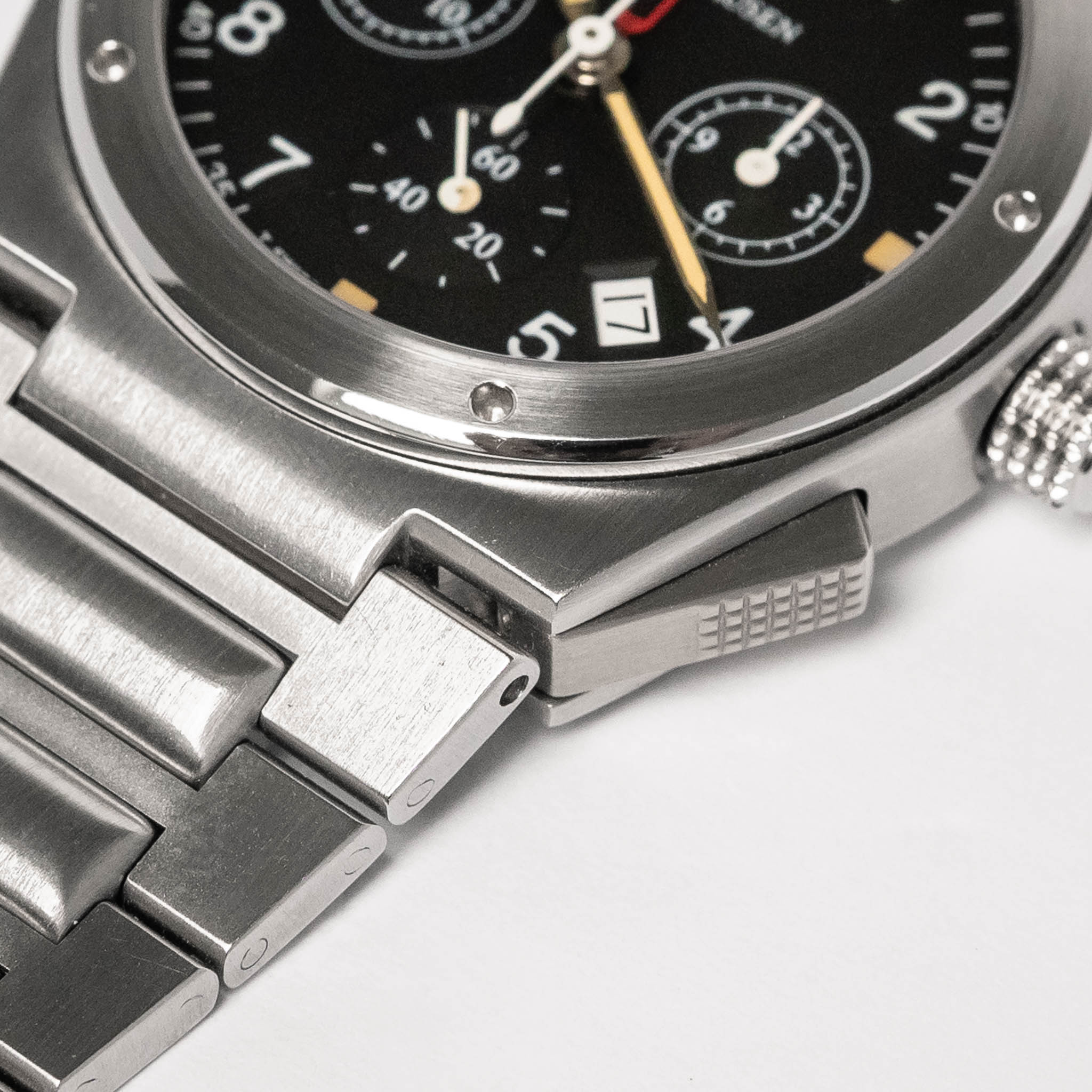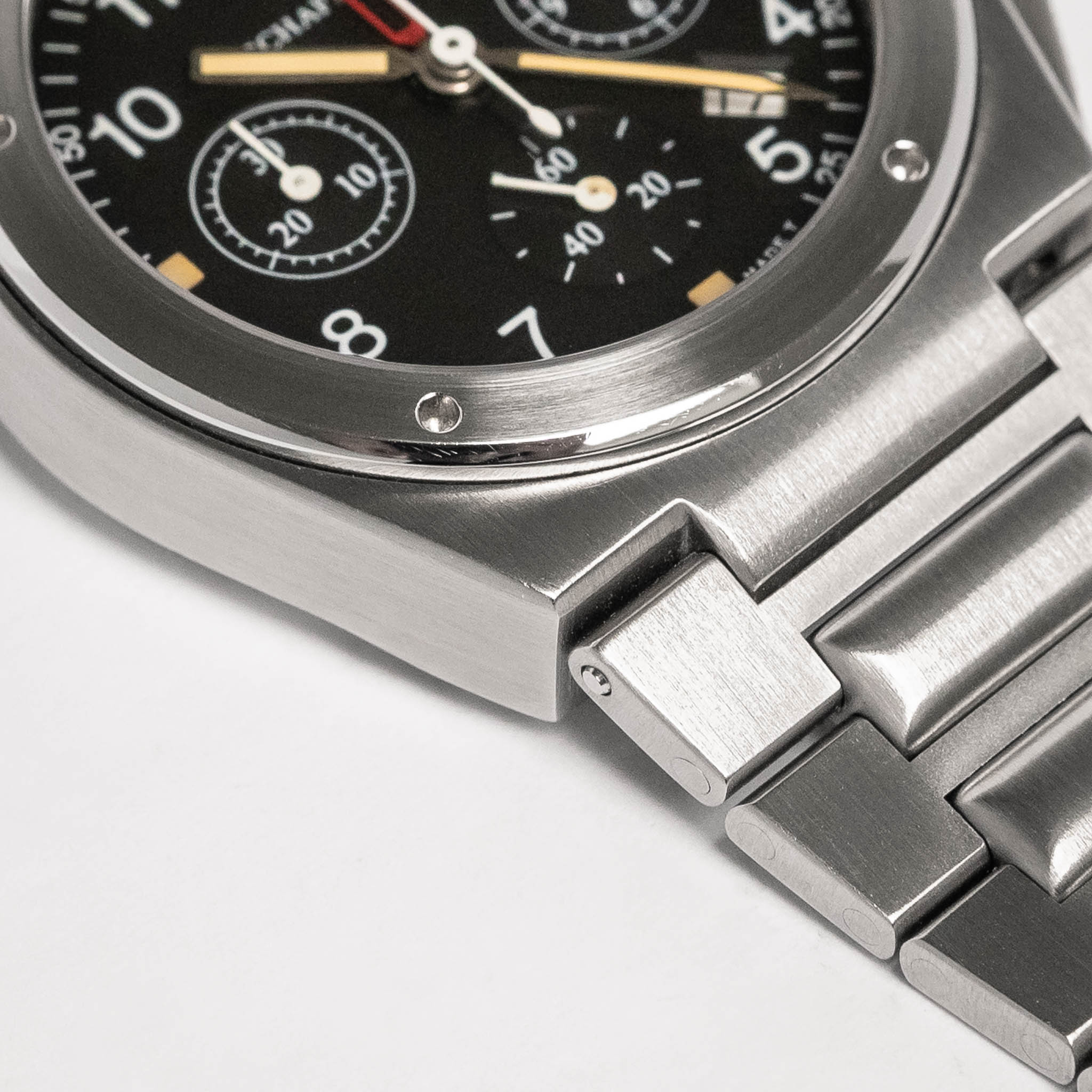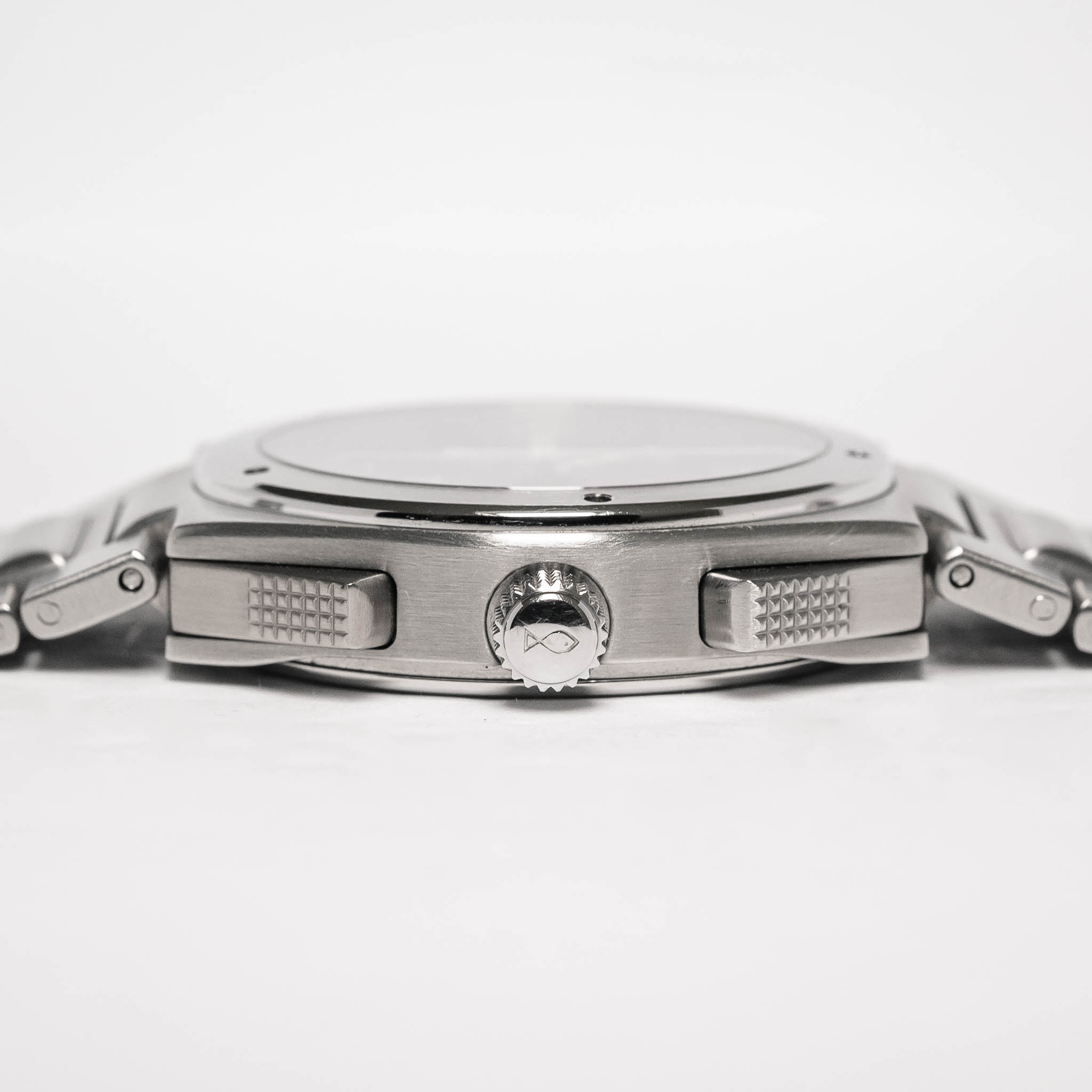 A workhorse movement like this needed a robust housing that could keep up. IWC delivered in 1991 with the sportiest Ingenieur yet — the reference 3805. Iterating on Genta's foundation for the Ingenieur, the Chrono Alarm added a flieger dial, knurled crowns and pushers, and a red skeleton alarm hand. For a watch with as much hubris, one might expect the case to be up-sized to match. Thankfully, designers opted to keep it the same 34mm size as the standard Ingenieurs of the time.