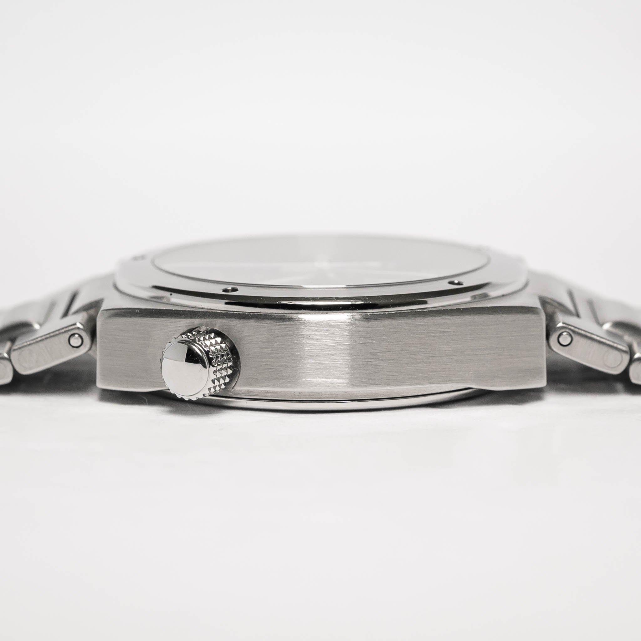Case: The stainless steel case shows minimal wear with only a couple faint hairlines and tiny nicks present. The overall impression is very clean. The lugs are thick and well-defined. The brushed bezel is in fantastic condition with crisp edges. The caseback shows a few hairlines and faint scuffs. The serial number engraving remains sharp and legible.