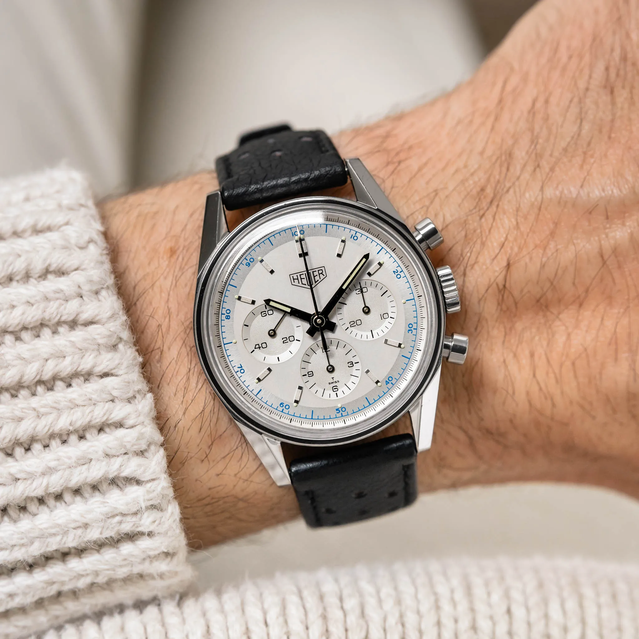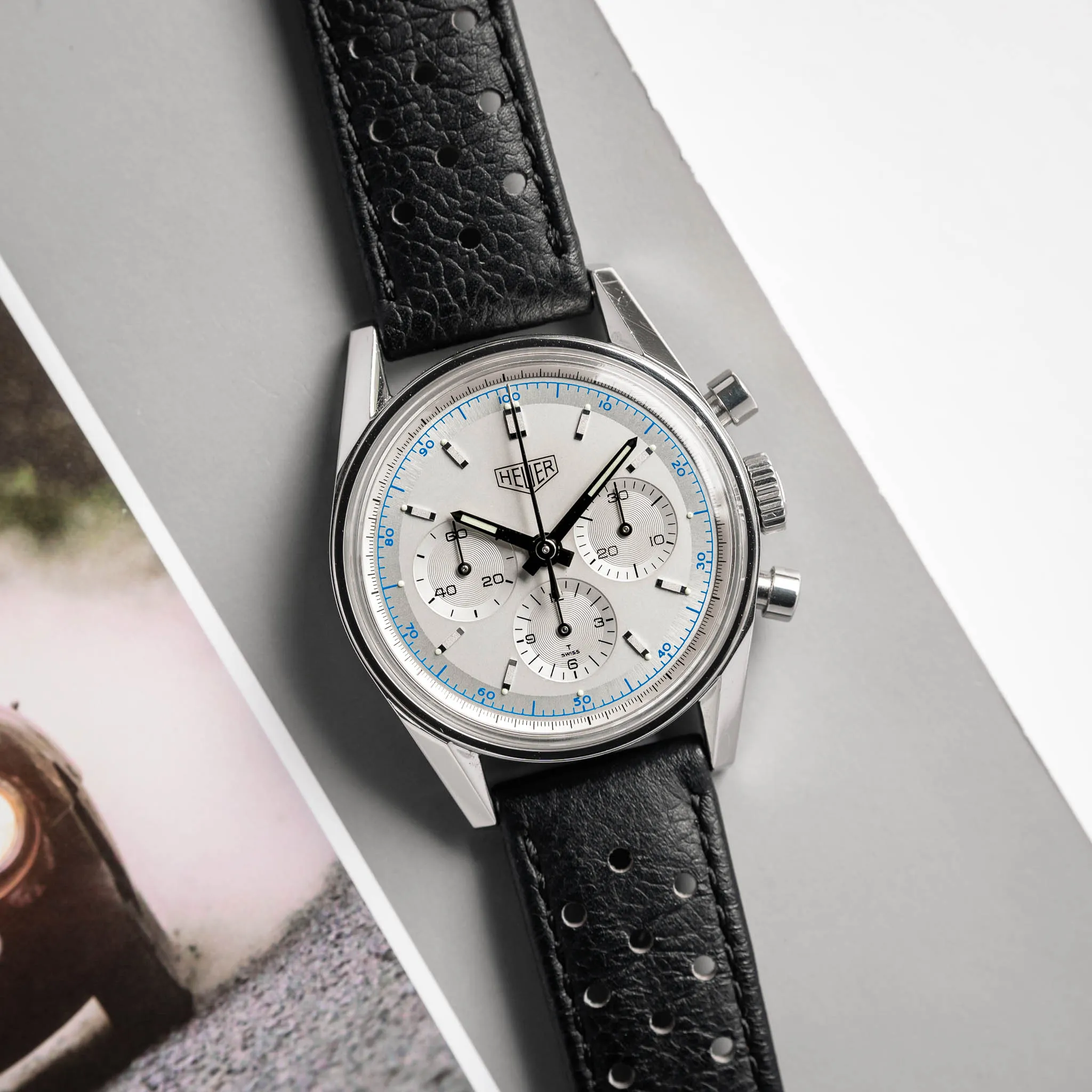 A Carrera Re-Edition with a superb silver dial, a perforated racing strap, and the Lemania 1873 hand-wound movement.