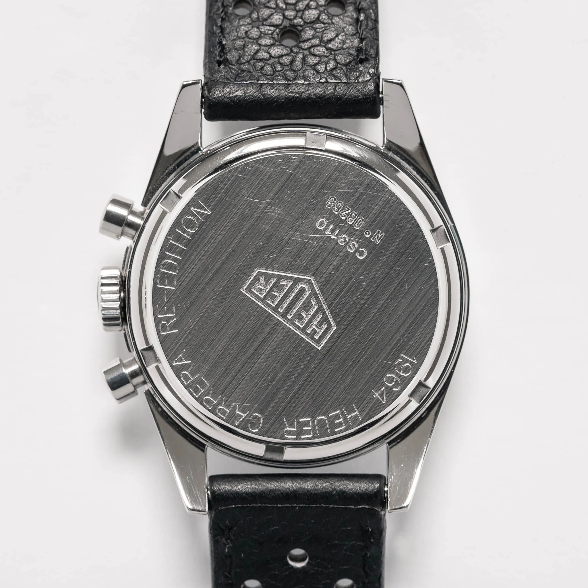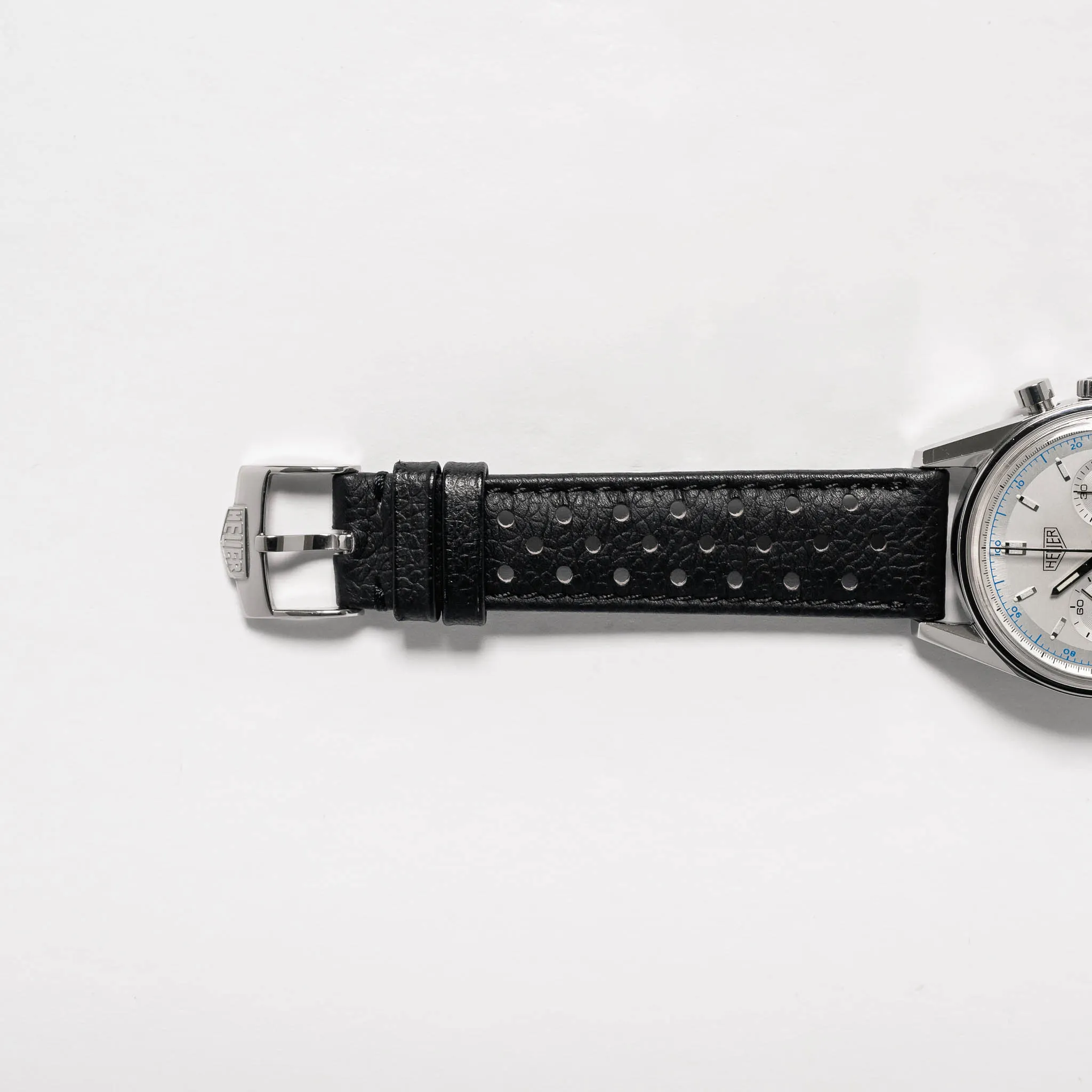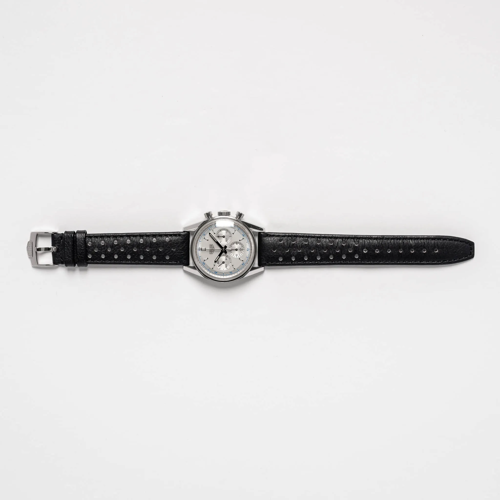 TAG Heuer Carrera 1964 Re-Edition on a black perforated calfskin strap.
