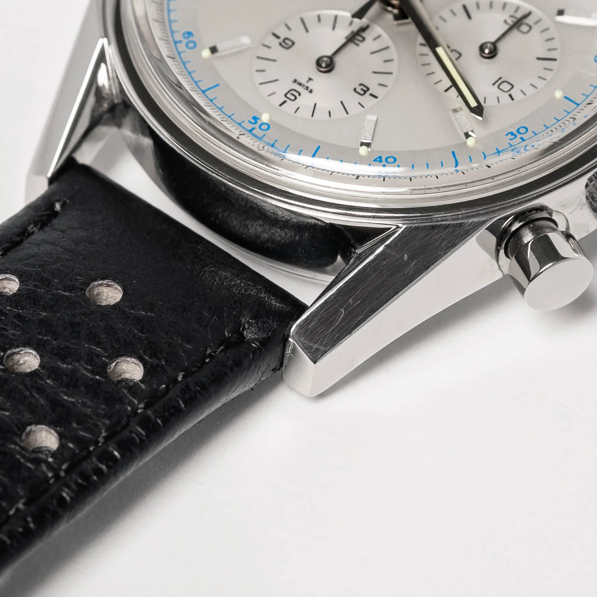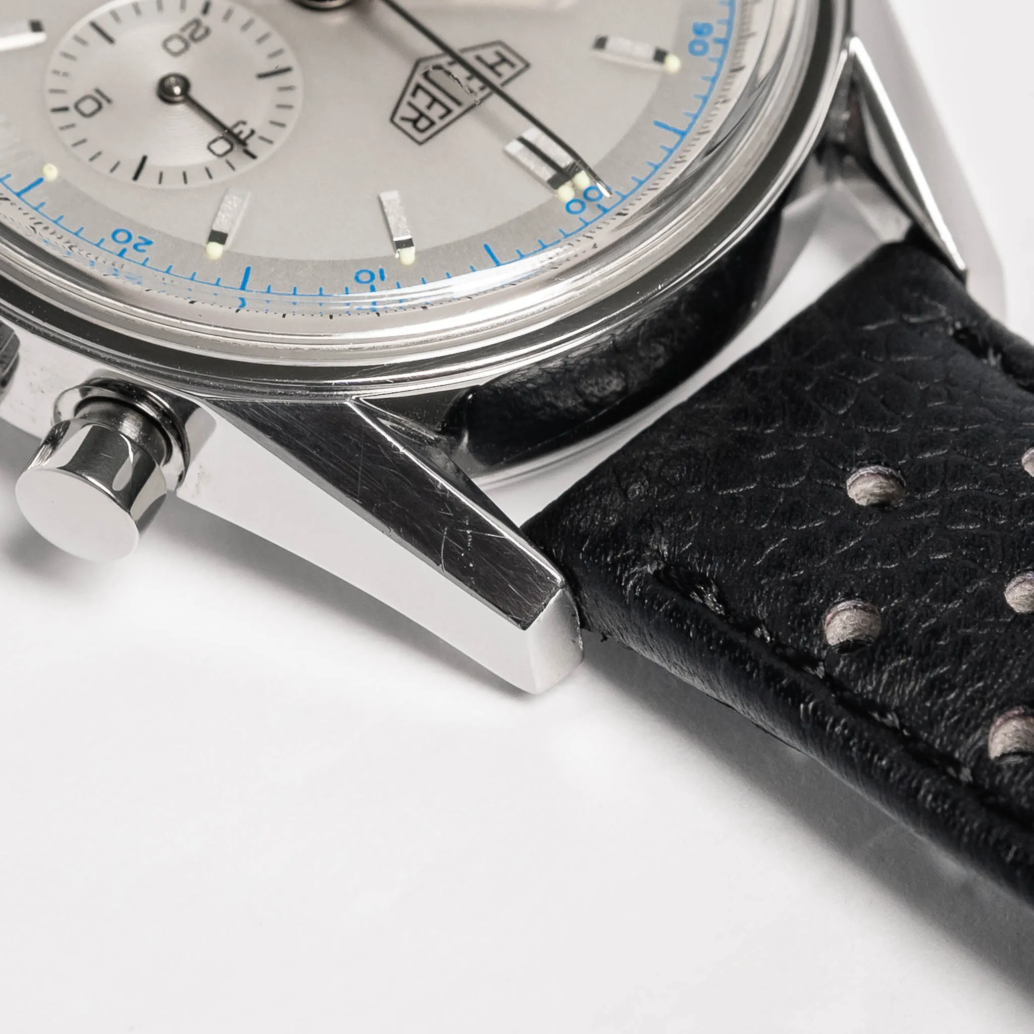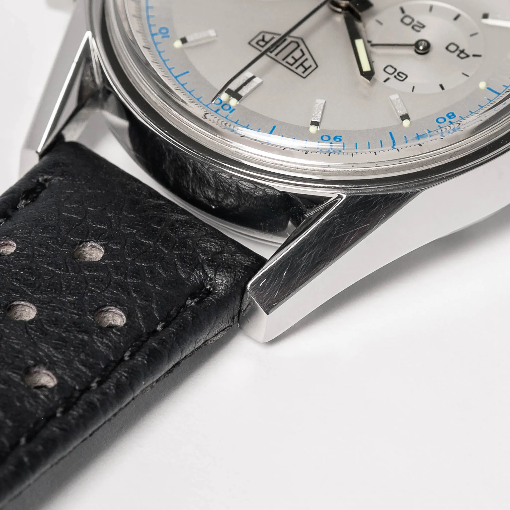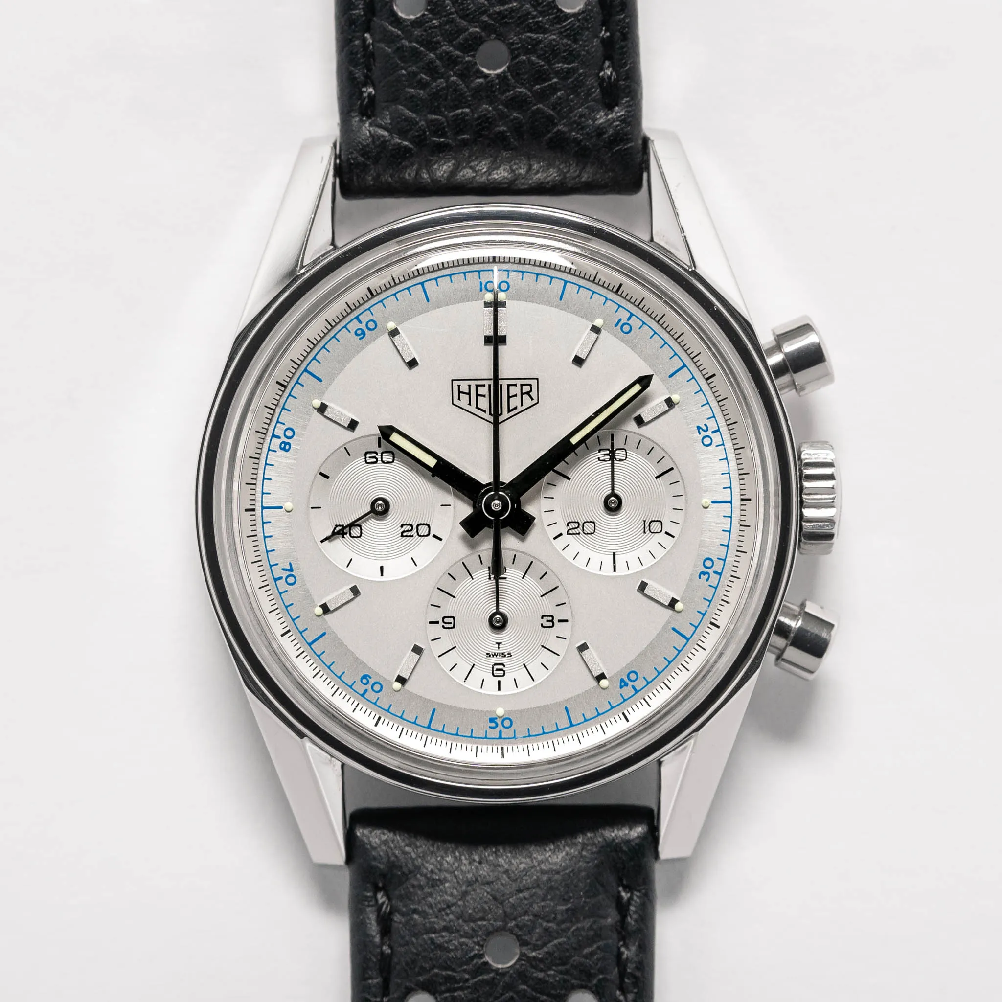 TAG Heuer Carrera 1964 Re-Edition on a black perforated calfskin strap.