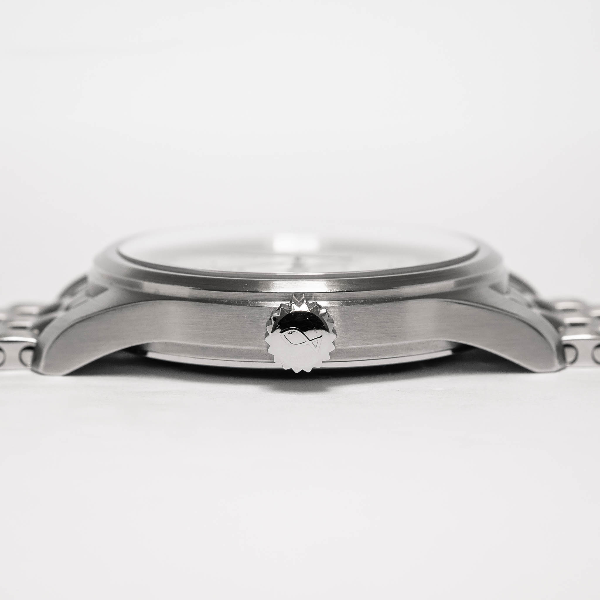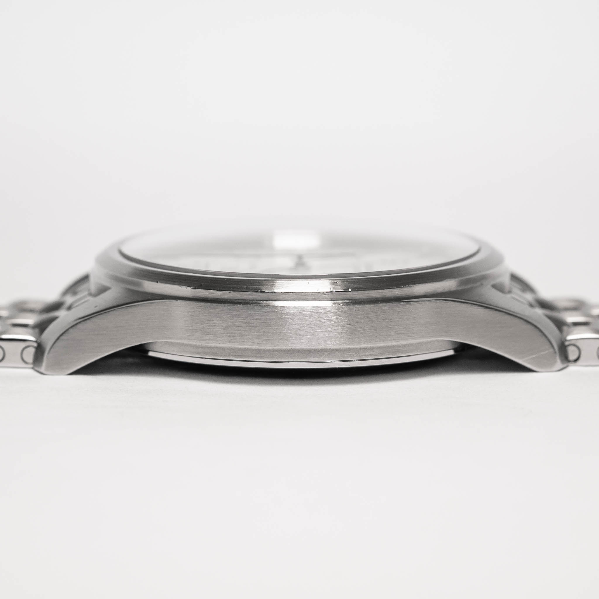 Case: The stainless steel case shows light wear with a few hairlines and small nicks present. The overall impression is clean. The lugs are thick and well-defined at the edges. The polished top portion of the bezel remains crisp. The caseback is consistent with the rest of the case, showing tiny nicks throughout with no major imperfections. The brand, model, and serial number engravings remain sharp and legible.