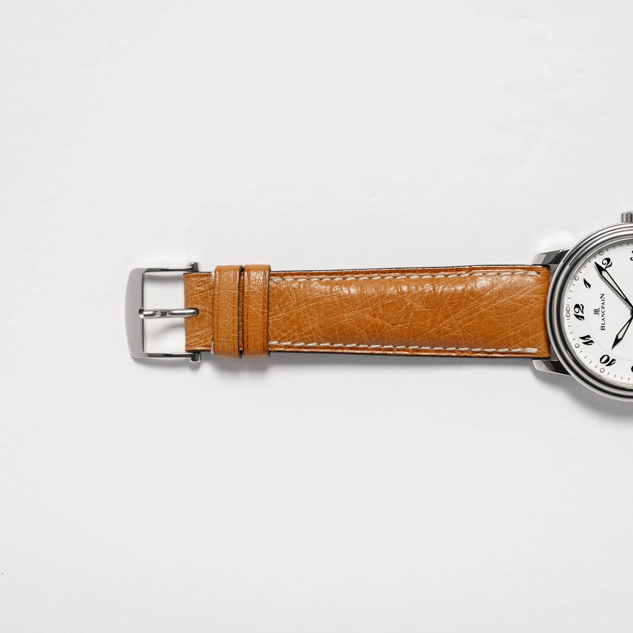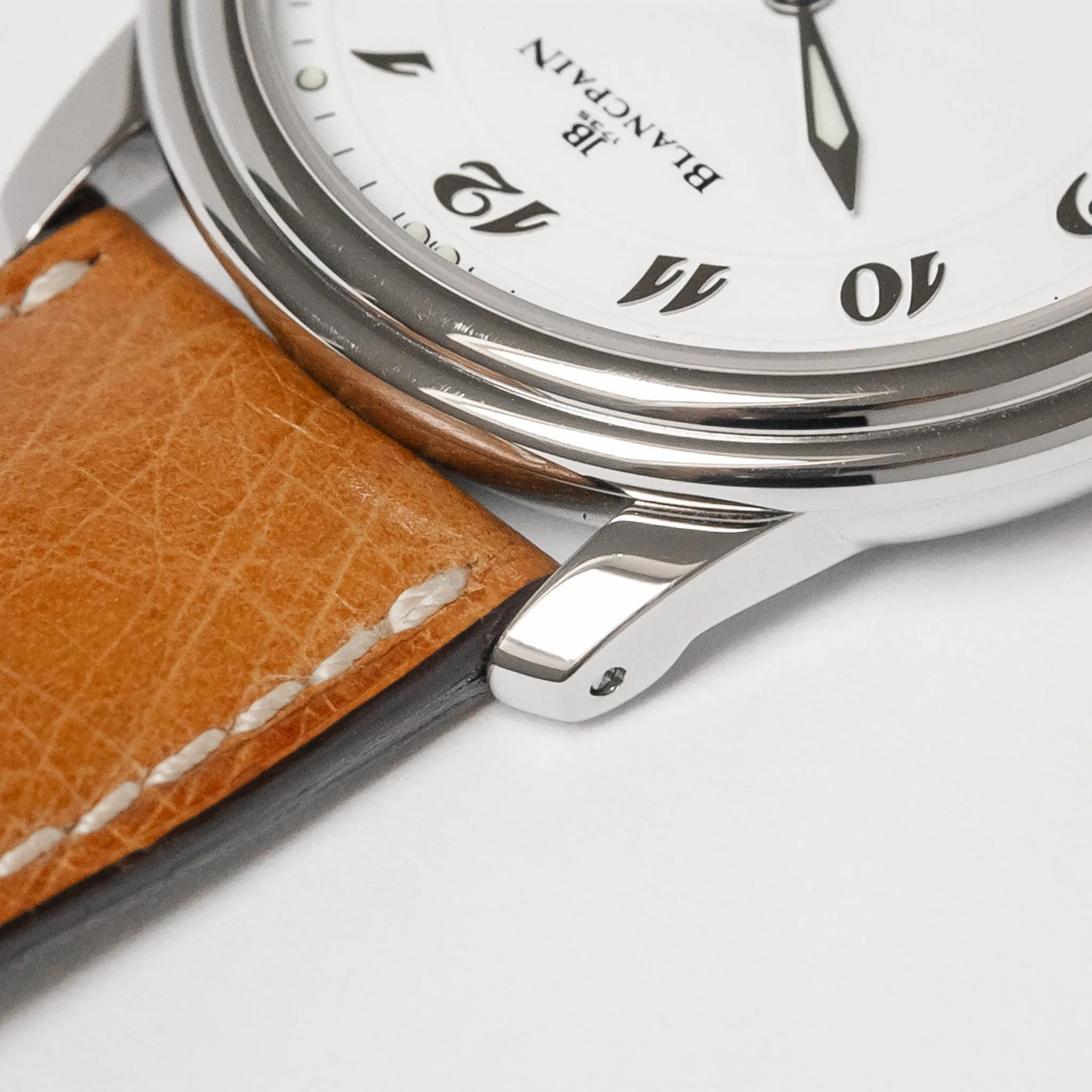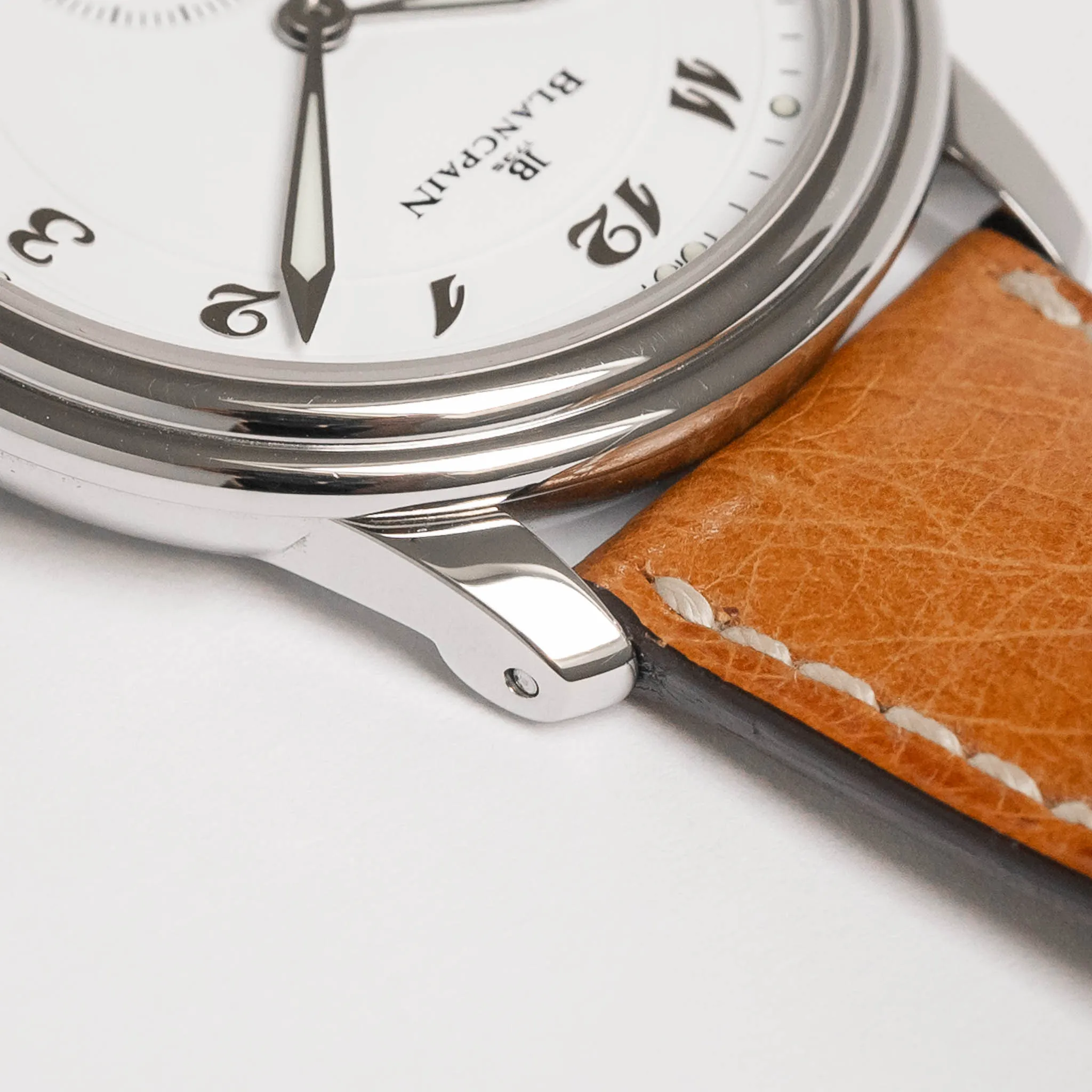 Bracelet/Strap: The Blancpain tan calfskin strap is in excellent condition with minimal signs of use. The leather backing shows darkening and faint creasing, but nothing major outside of that. The condition of the Blancpain-signed buckle is consistent with the rest of the case.