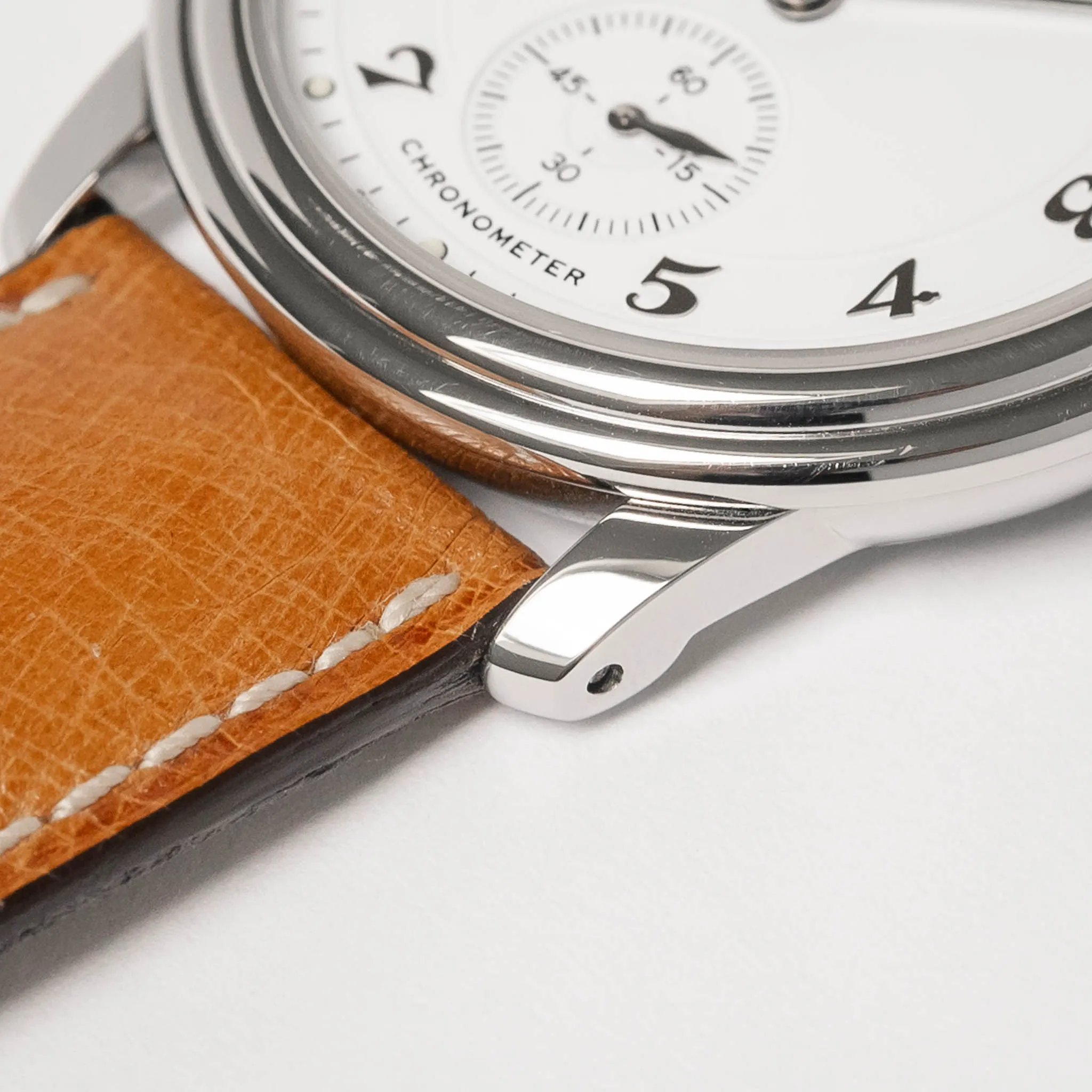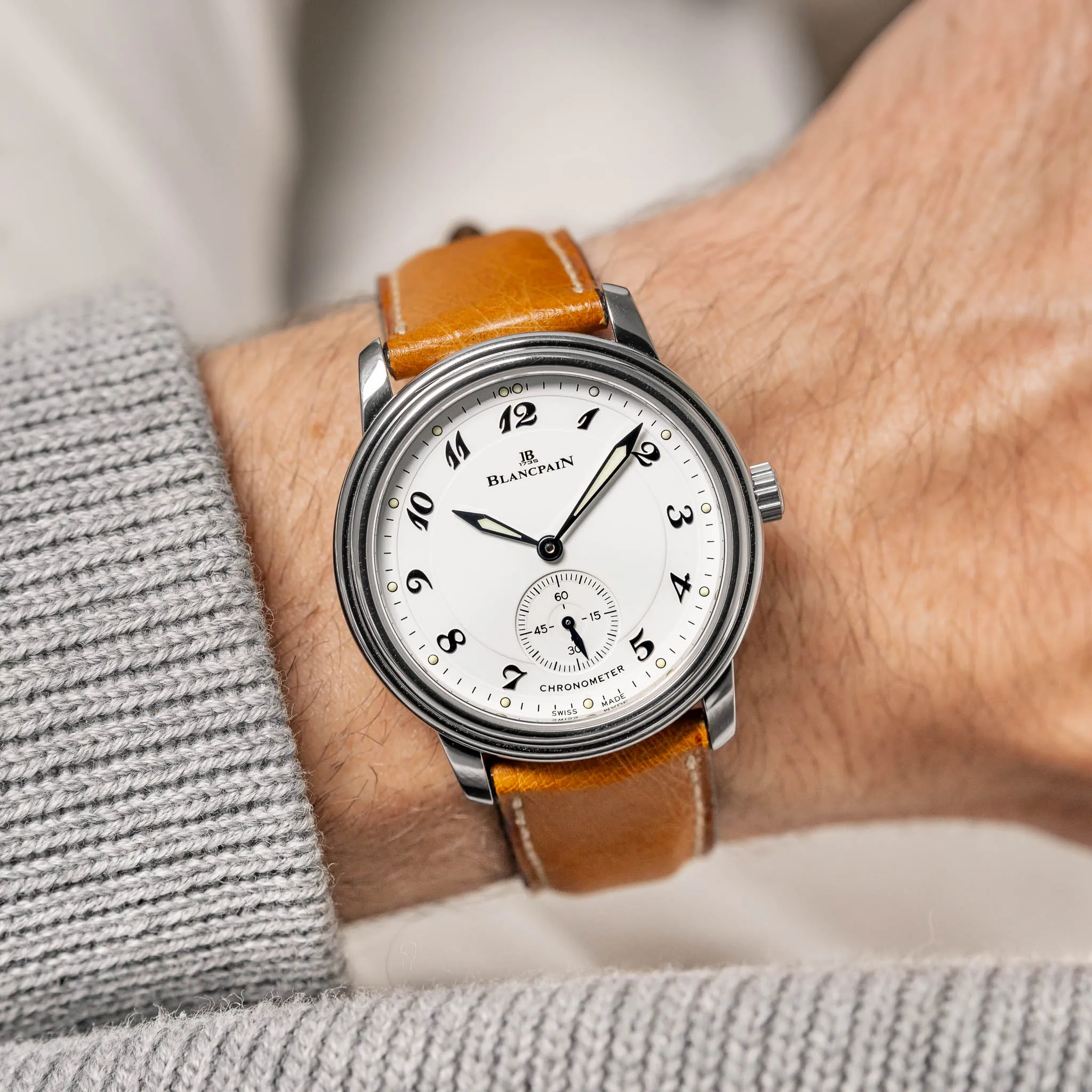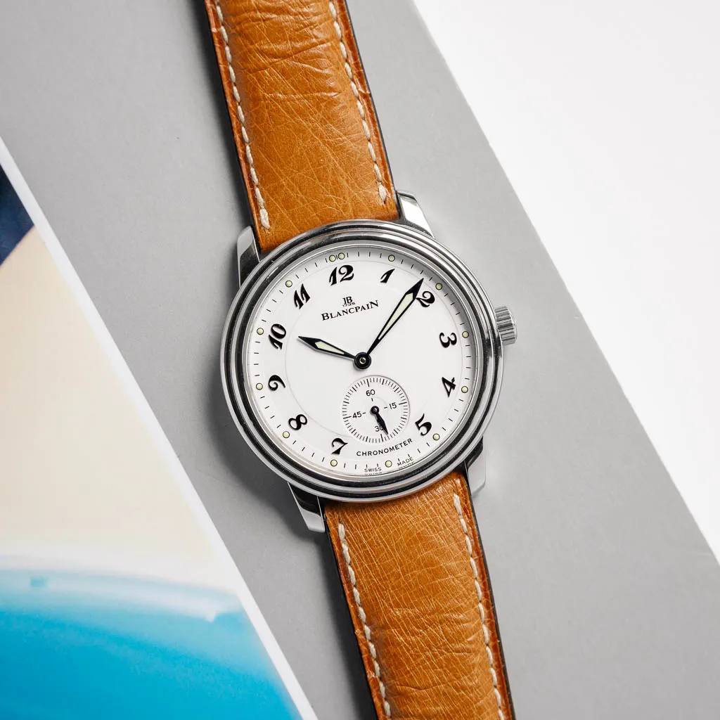 A Chronometer with an exquisite white dial, an ultra-thin case, and the Blancpain 64-1 hand-wound movement.
