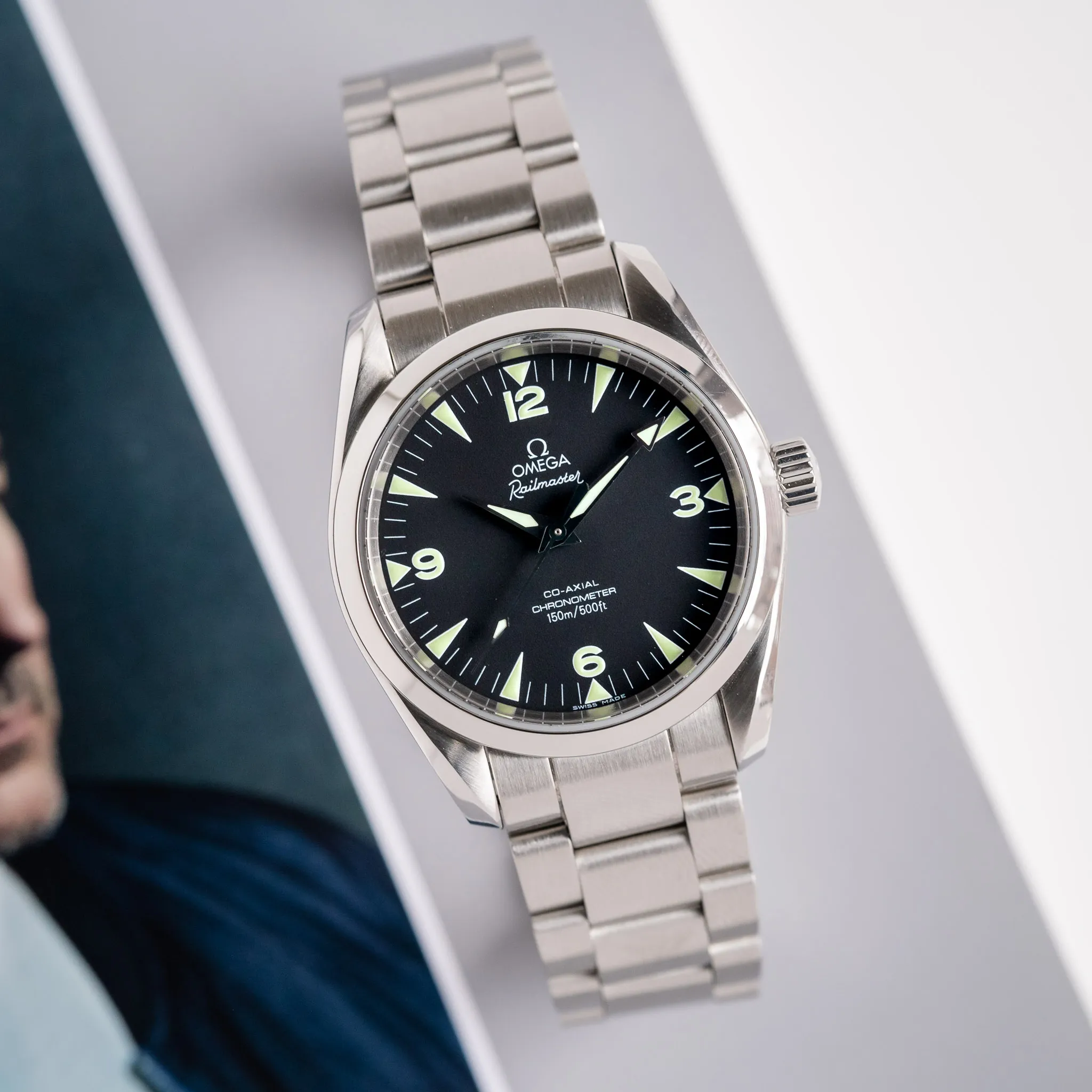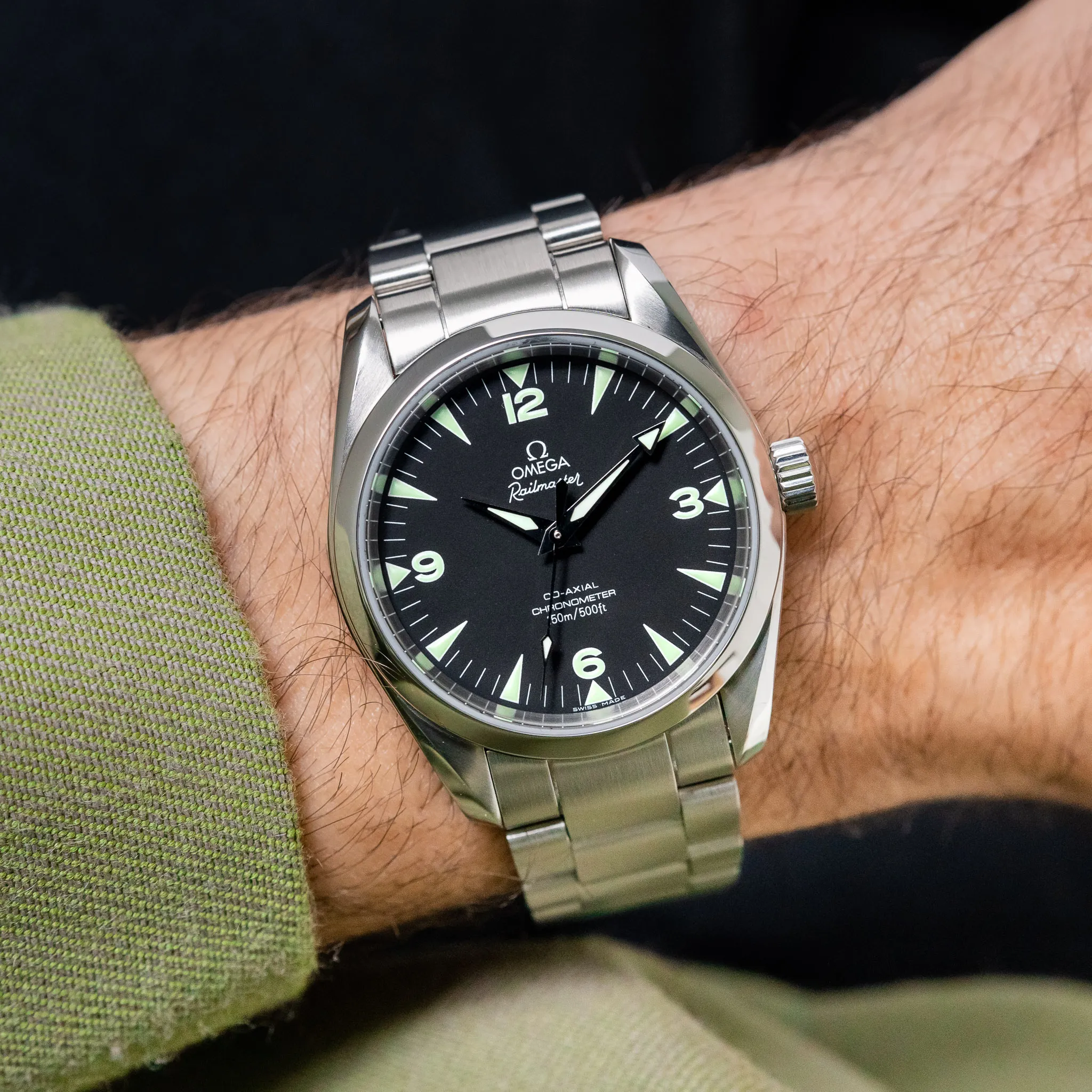 A Railmaster with a striking black dial, a rare and minty 36mm case, and the Omega 2403 automatic movement.