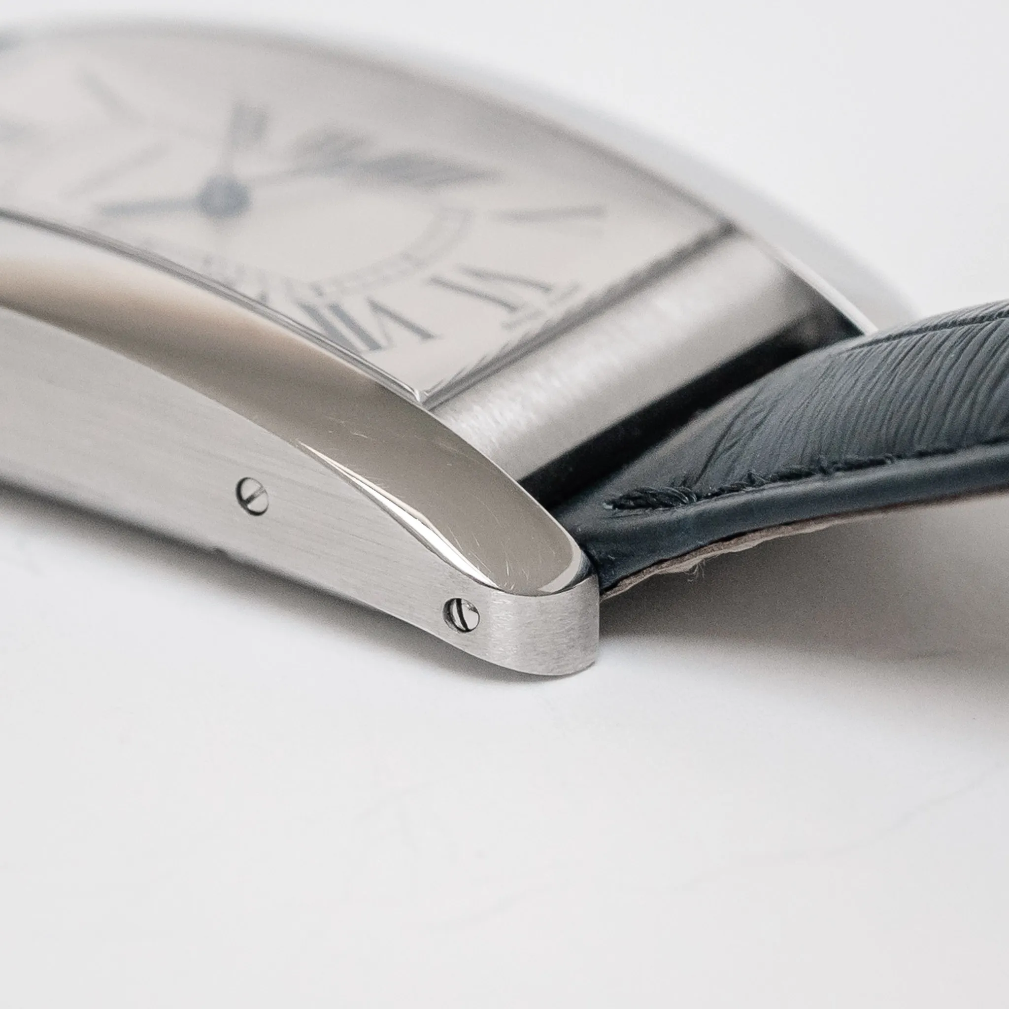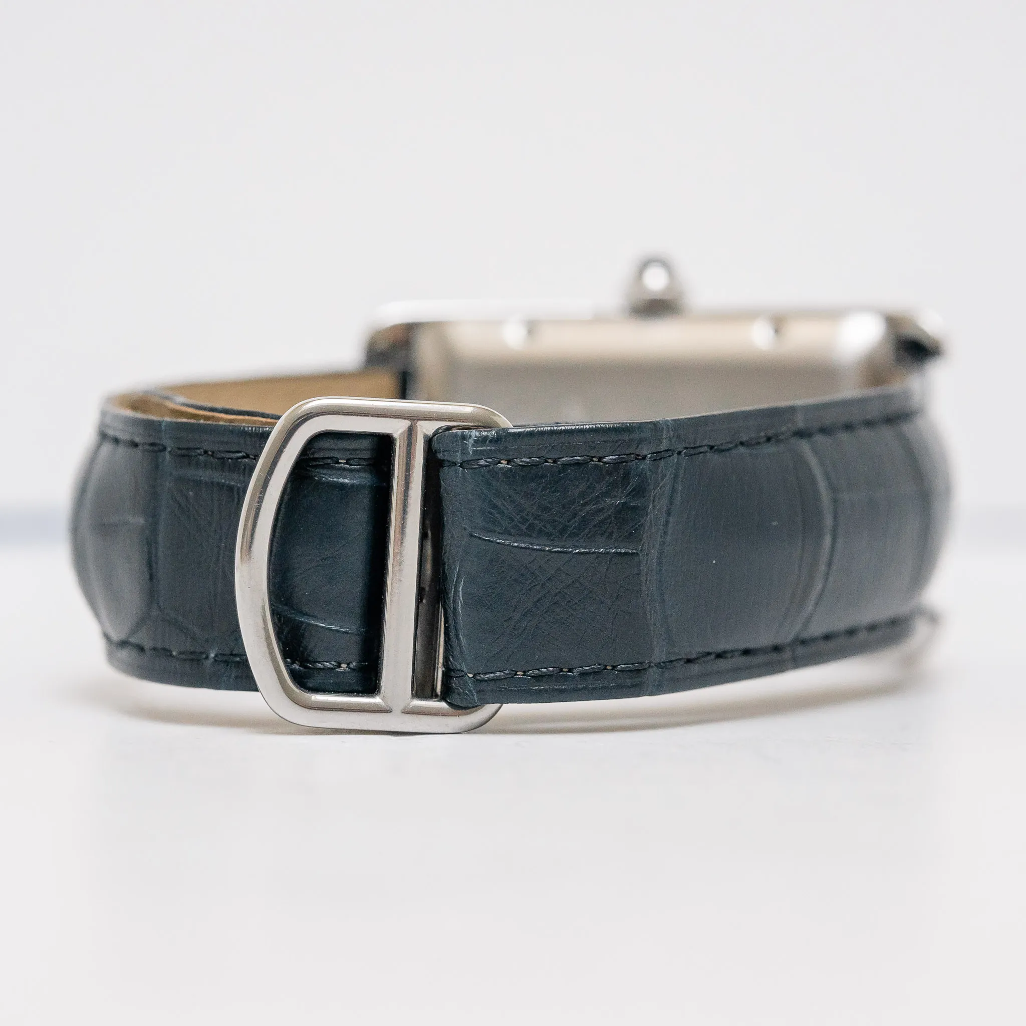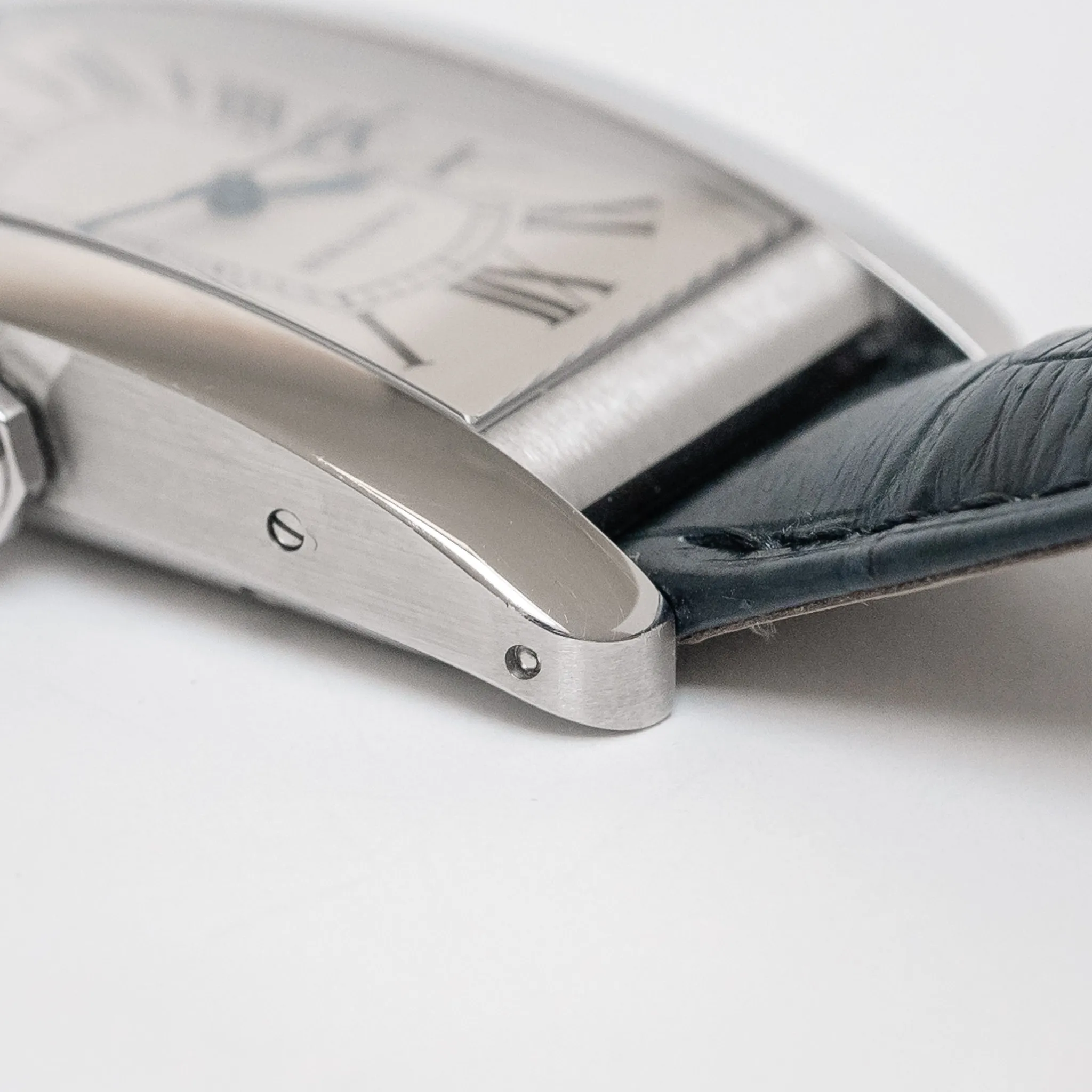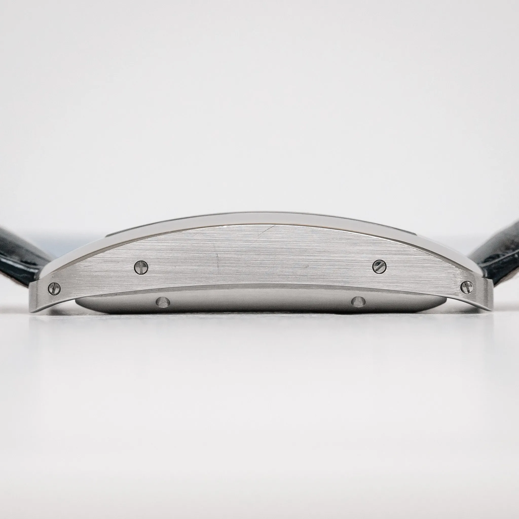 A Tank Américaine with a silvered dial, an elegantly elongated steel case, and the ETA 2671 automatic movement.