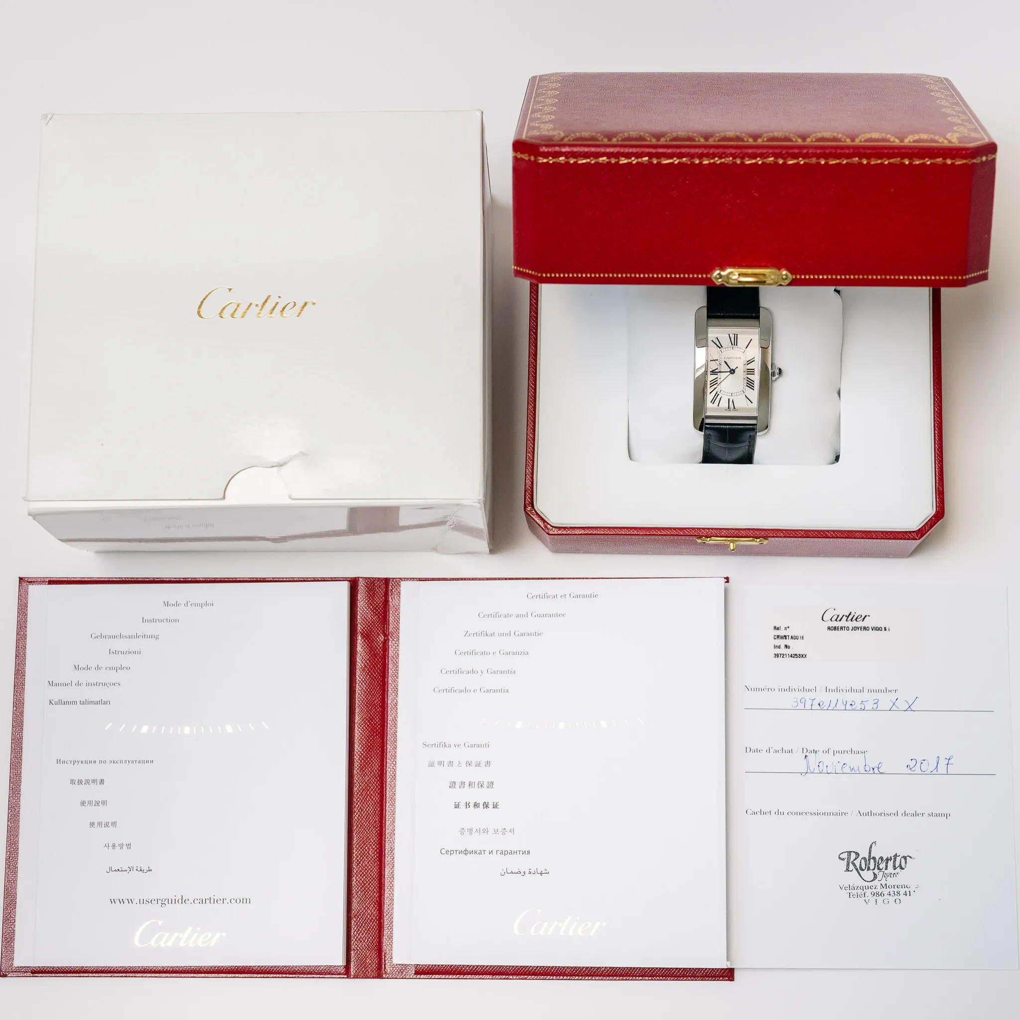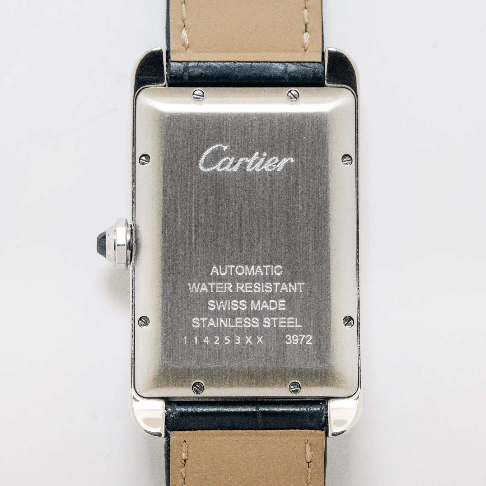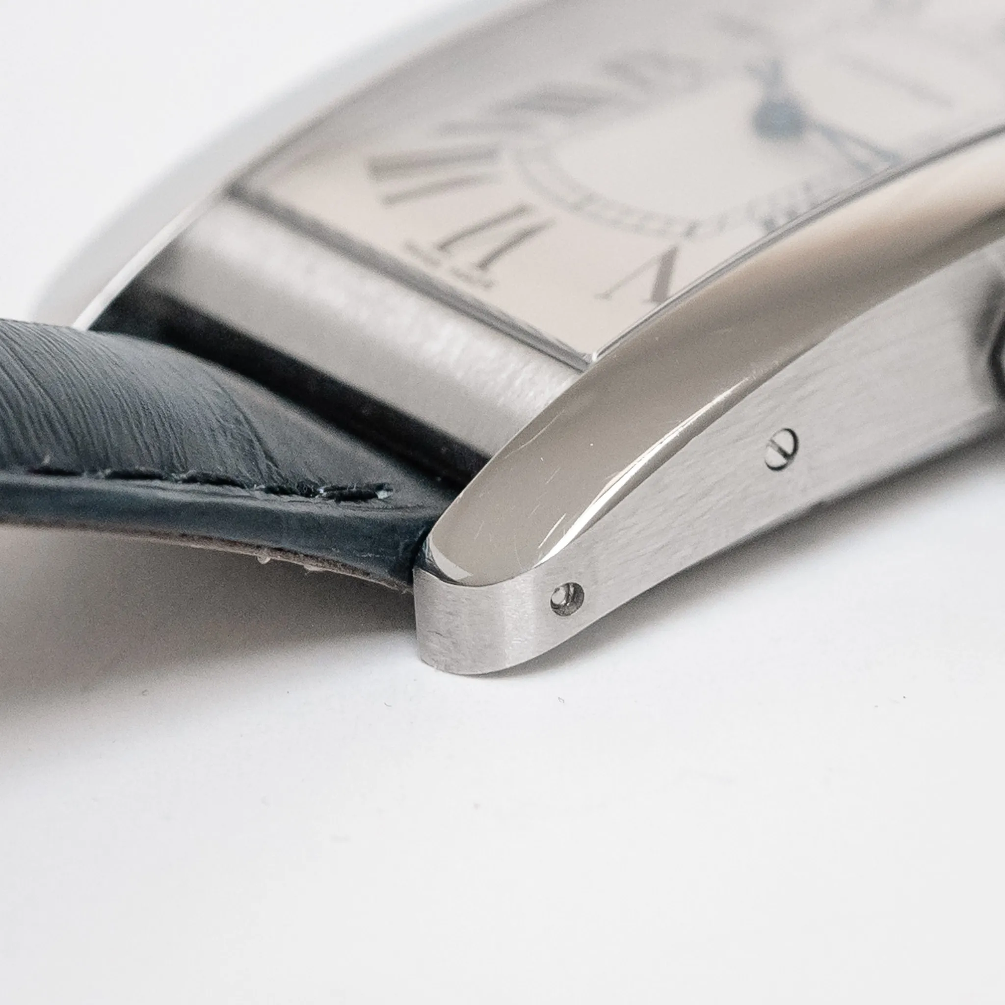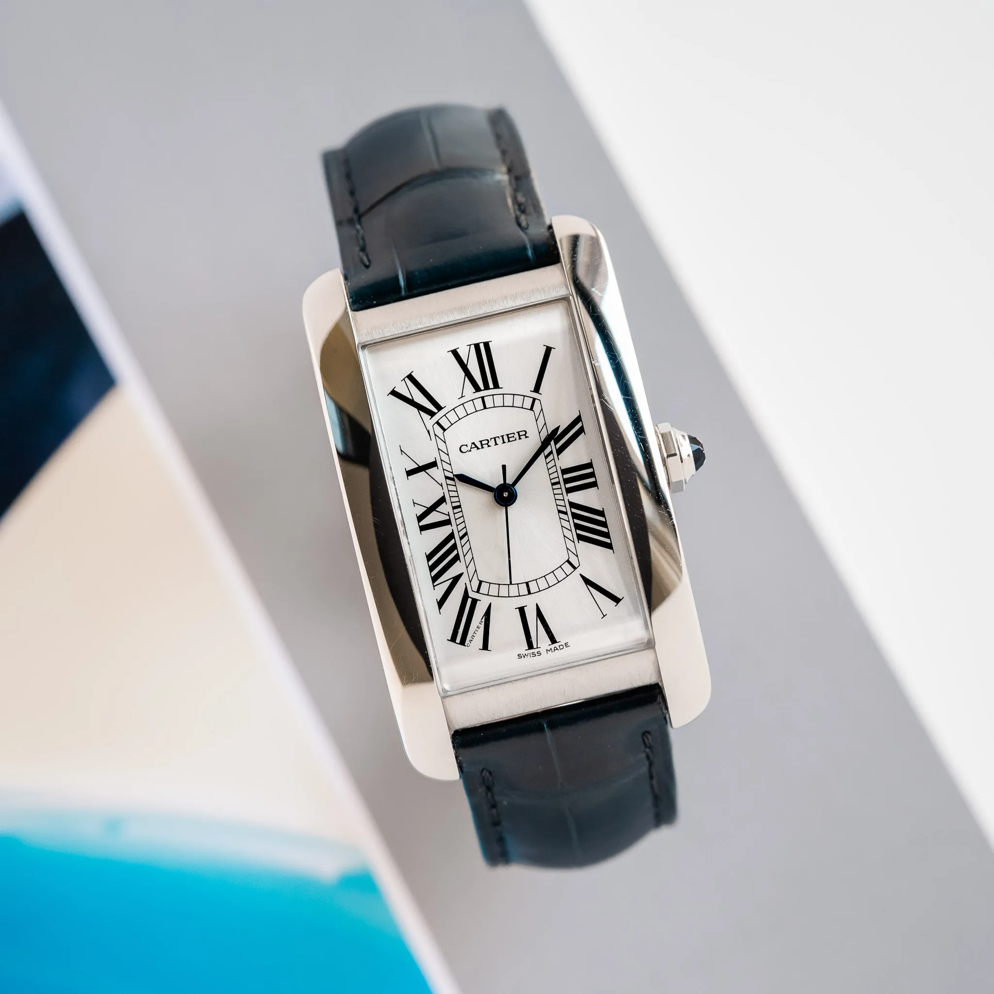 A Tank Américaine with a silvered dial, an elegantly elongated steel case, and the ETA 2671 automatic movement.