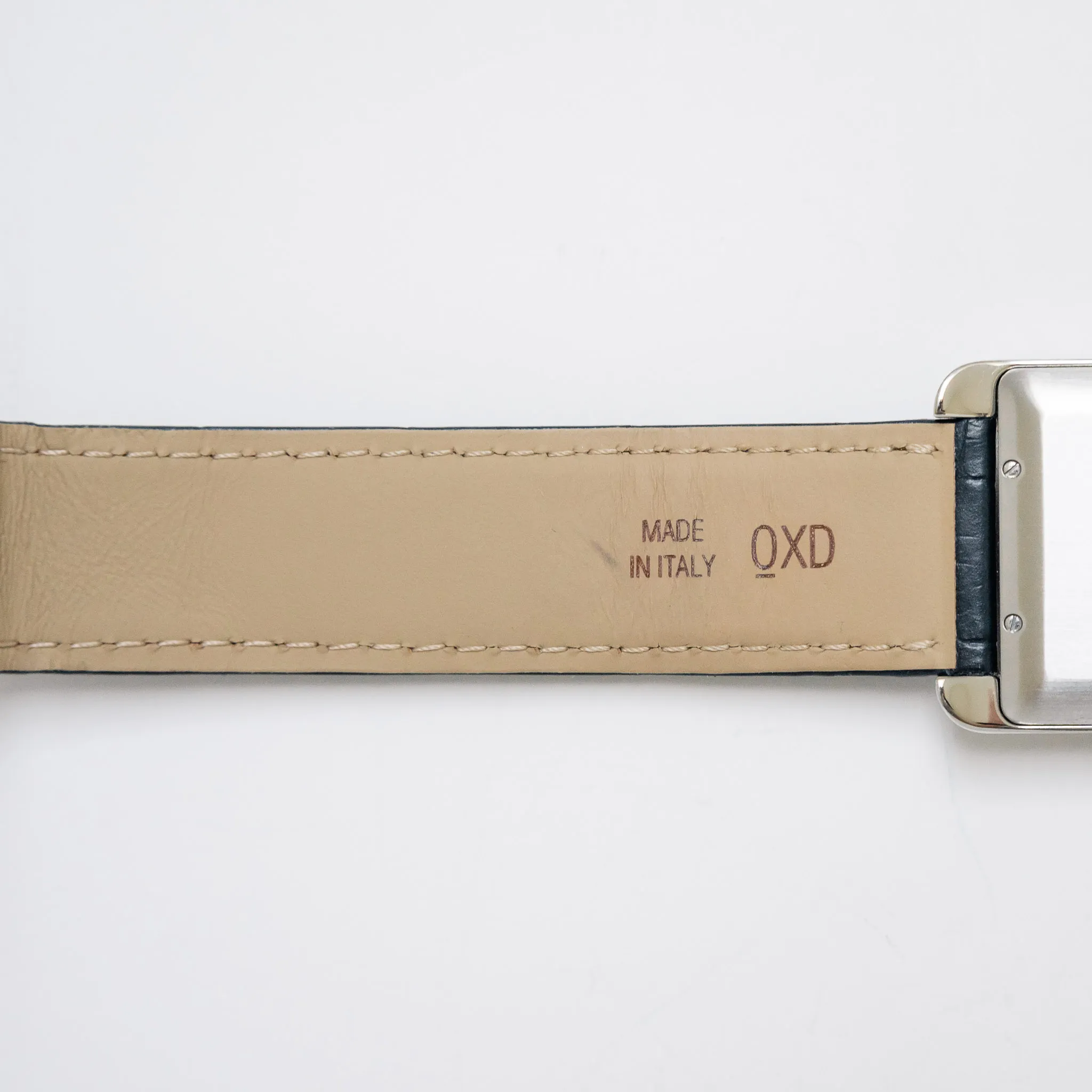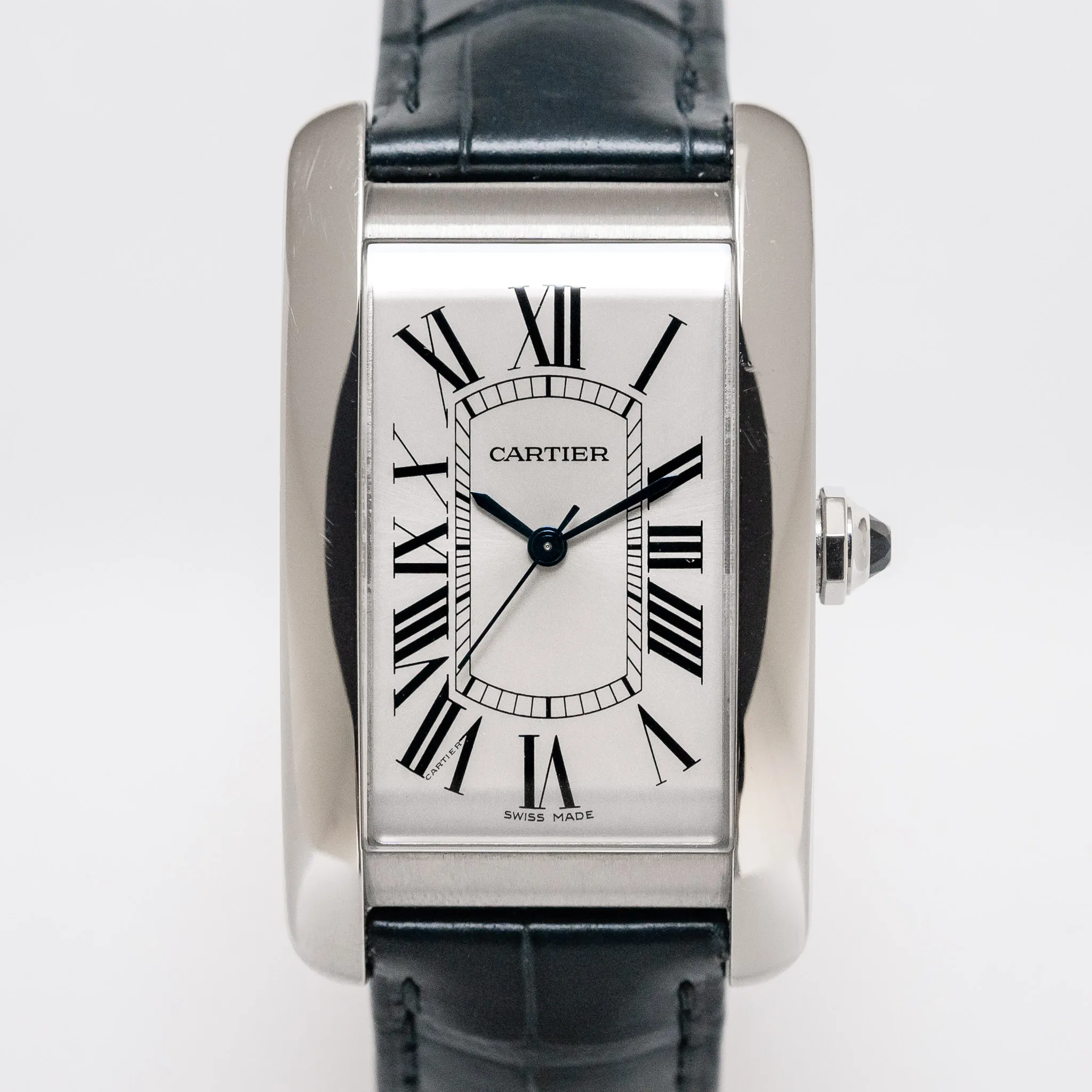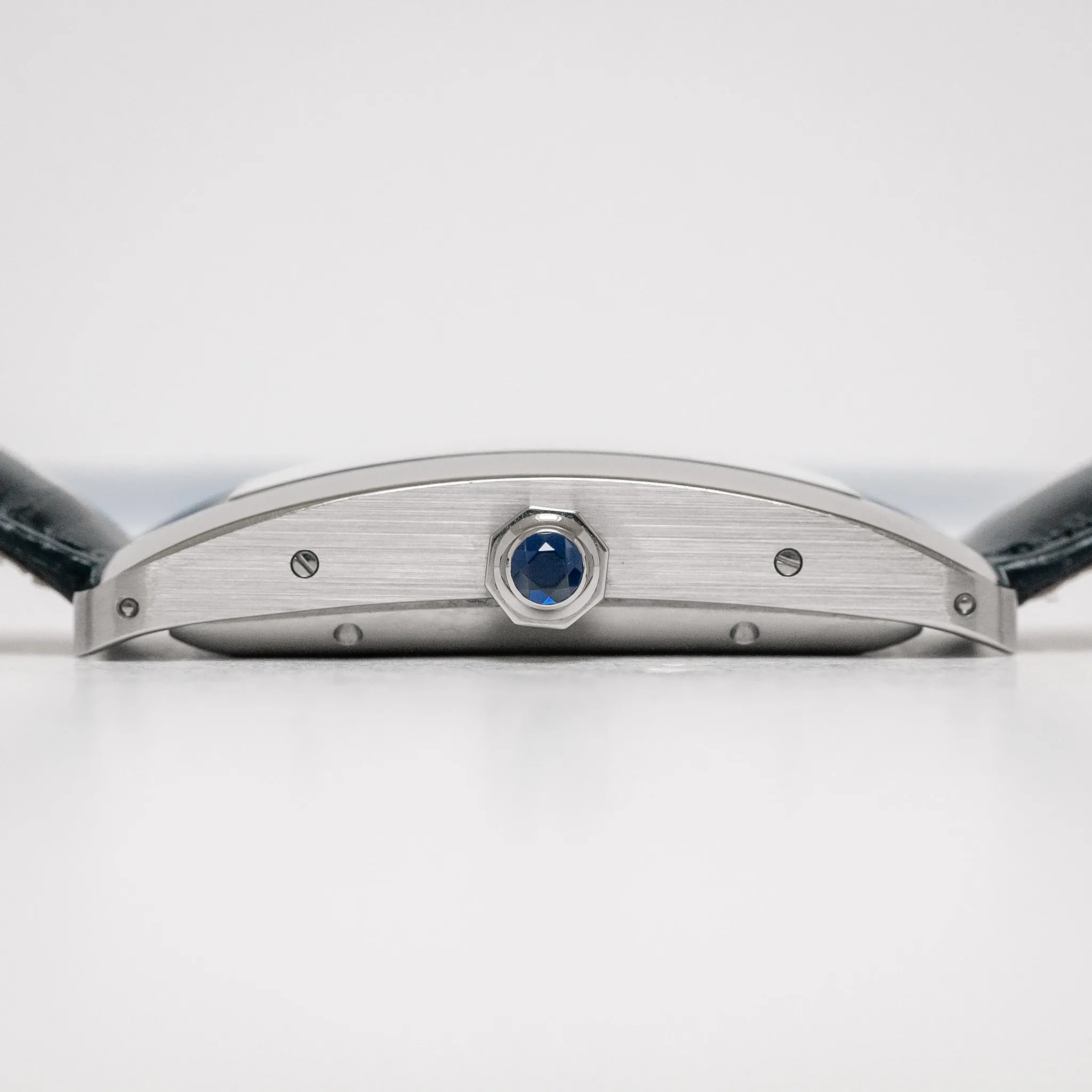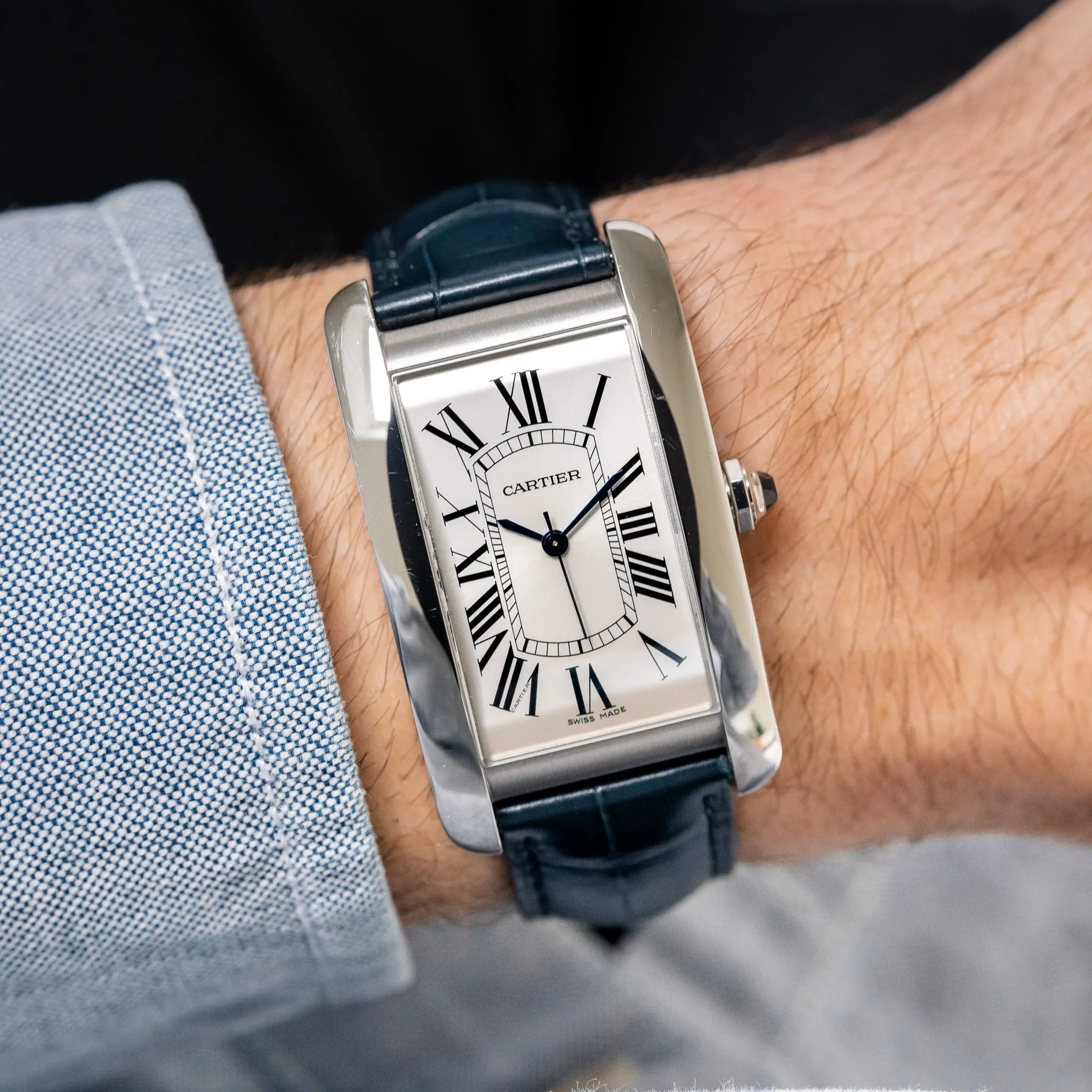 The Tank Américaine was first released in 1989 in yellow gold and was distinctively heftier and longer than the traditional Tank. Throughout the 1990s and 2000s the watch was produced in a variety of designs and sizes using precious metals only. Then, in 2017, Cartier unveiled the first series of the Tank Américaine in stainless steel. There were 3 sizes released and what we have here is the largest, reference WSTA0018. The case measures 26.6mm by 45.10mm and 9.65mm thick and certainly feels substantial and modern, yet still retains a high level of classical elegance thanks to its simple, curved case.