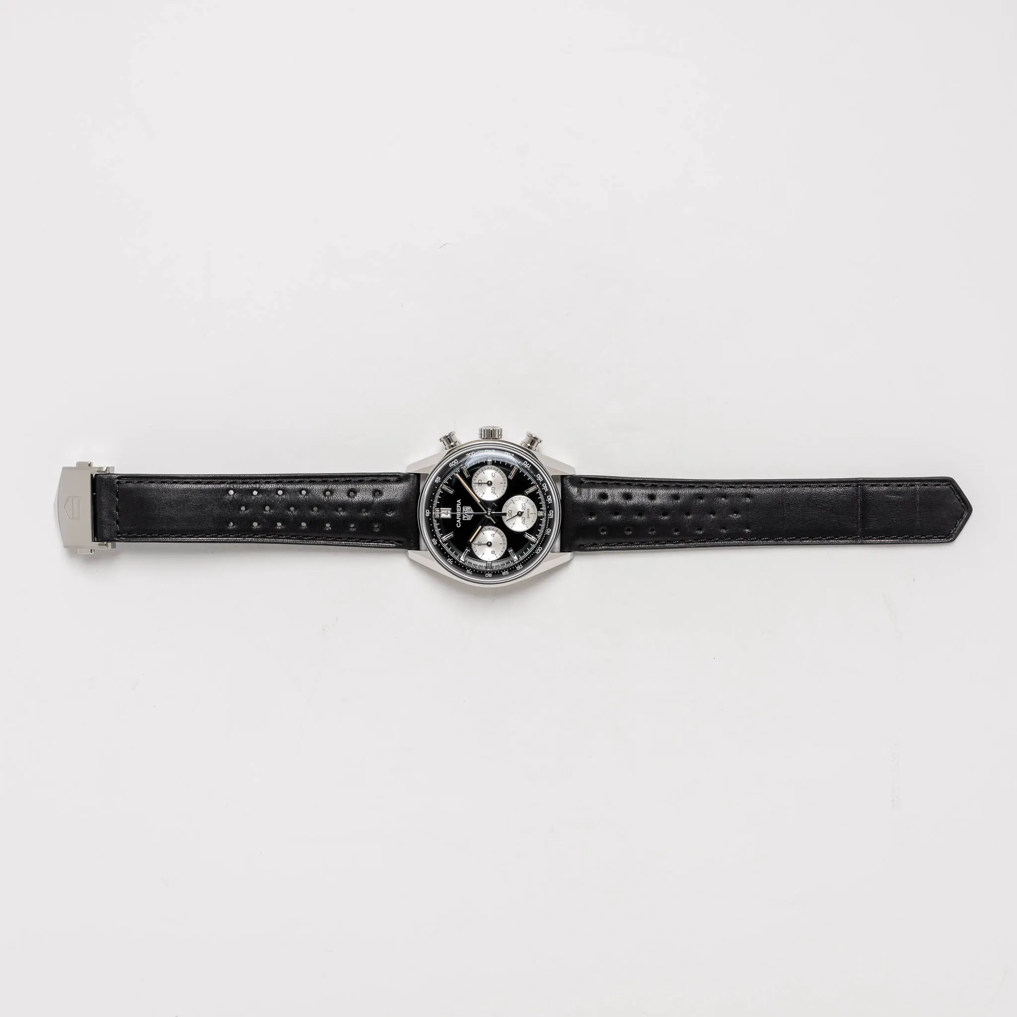TAG Heuer black perforated calfskin strap with push button deployant clasp.